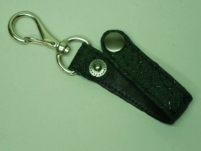 端にスナップフックが付いています。バネボタンが付いているので開いてキーや飾り品を取り付けることができます。