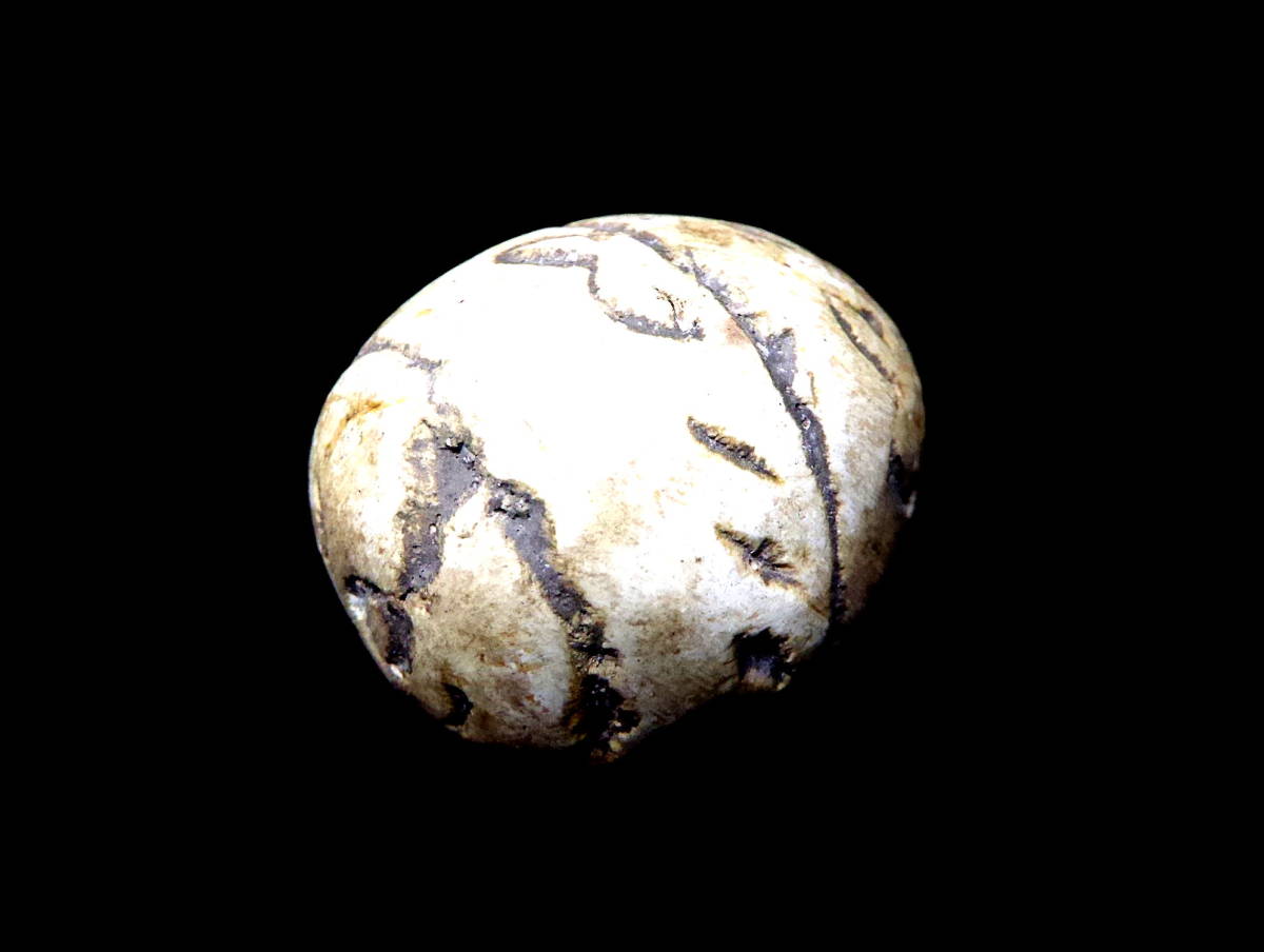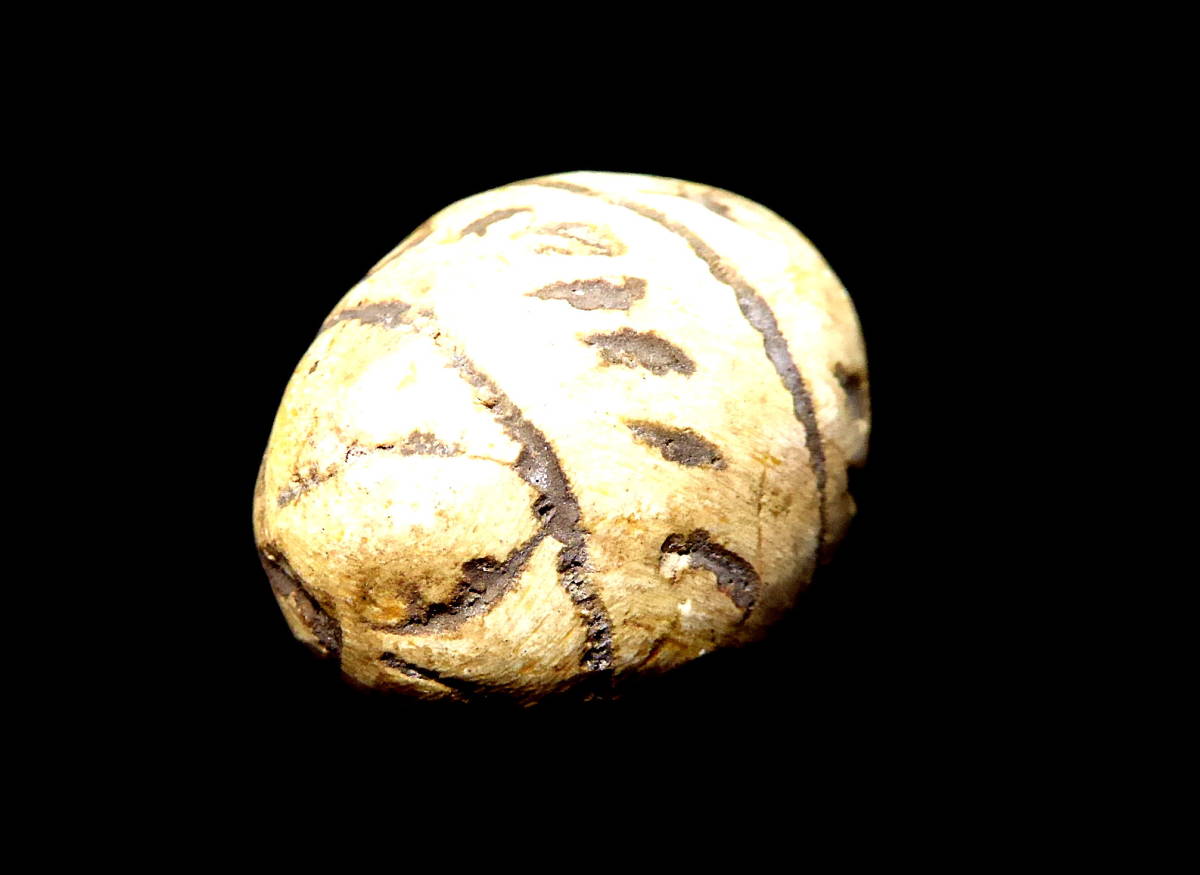 この“奇跡の石(Batu Ajaib)”の特徴は、軽く振ると、中でコロコロと音が鳴ることでしょう。要するに石の中に空間があって、その中に小さな石が入っている。そんな感じがします。つまり鈴のような構造をしているものと思われます。また、この白い、ウズラの卵のような“奇跡の石の場合、意味不明の象形文字のようなものと、花柄のような図形も彫られています。ある種の信仰の呪文かもしれませんが、詳しいことは全く分かりません。かつて、首都ジャカルタの一流デパート(パサラヤ)で、密やかに売られていたことがありましたが、今ではもうありません。店員も「そういえばそんな石もありましたね。でも二度と入荷はしないでしょう。だって、あの石はめったに見つからないそうですから」と言う。本当かどうかは確かめようもない。しかし、ここにある“奇跡の石”は、首都ジャカルタのコレクターから分けてもらいました。「この石にはとんでもない力が秘められています。願い事がかなう石です。毎日振って、お願い事をすればネ!」と彼は言います。信じる信じないは、確かに個人の勝手ですが、インドネシア文化宮(GBI)としては、その“効力”に責任を負うことは不可能です。ただ、このような「信仰文化」もあります、という意味で紹介、出品します。定形外普通郵便で発送し、送料はこちらで負担いたします。