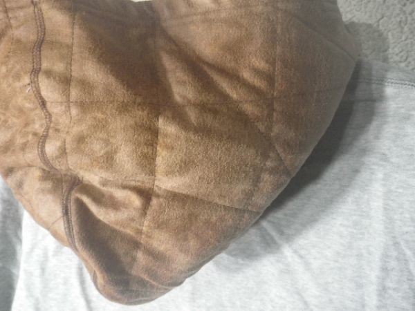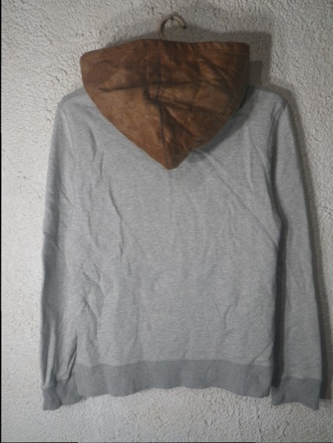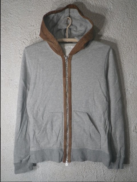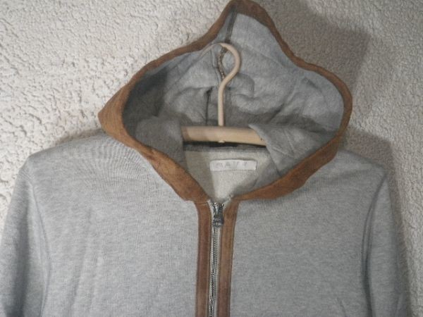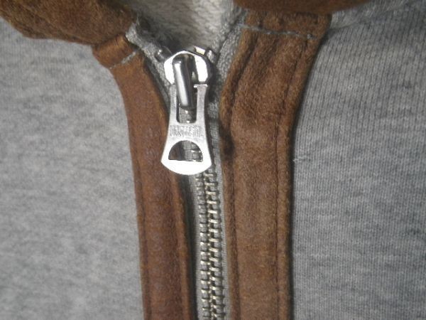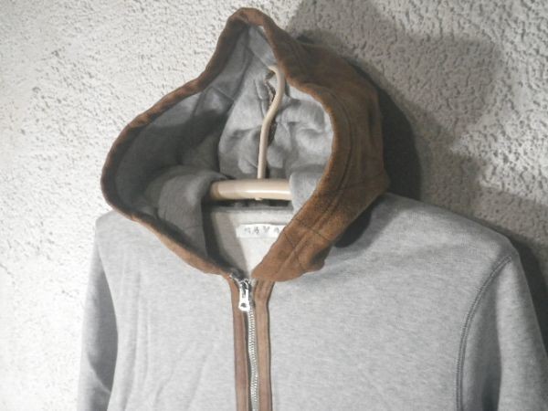 フード、ジップ横の切り替え部分が表記コットンとポリですがスエード、革っぽい仕上げになっております。