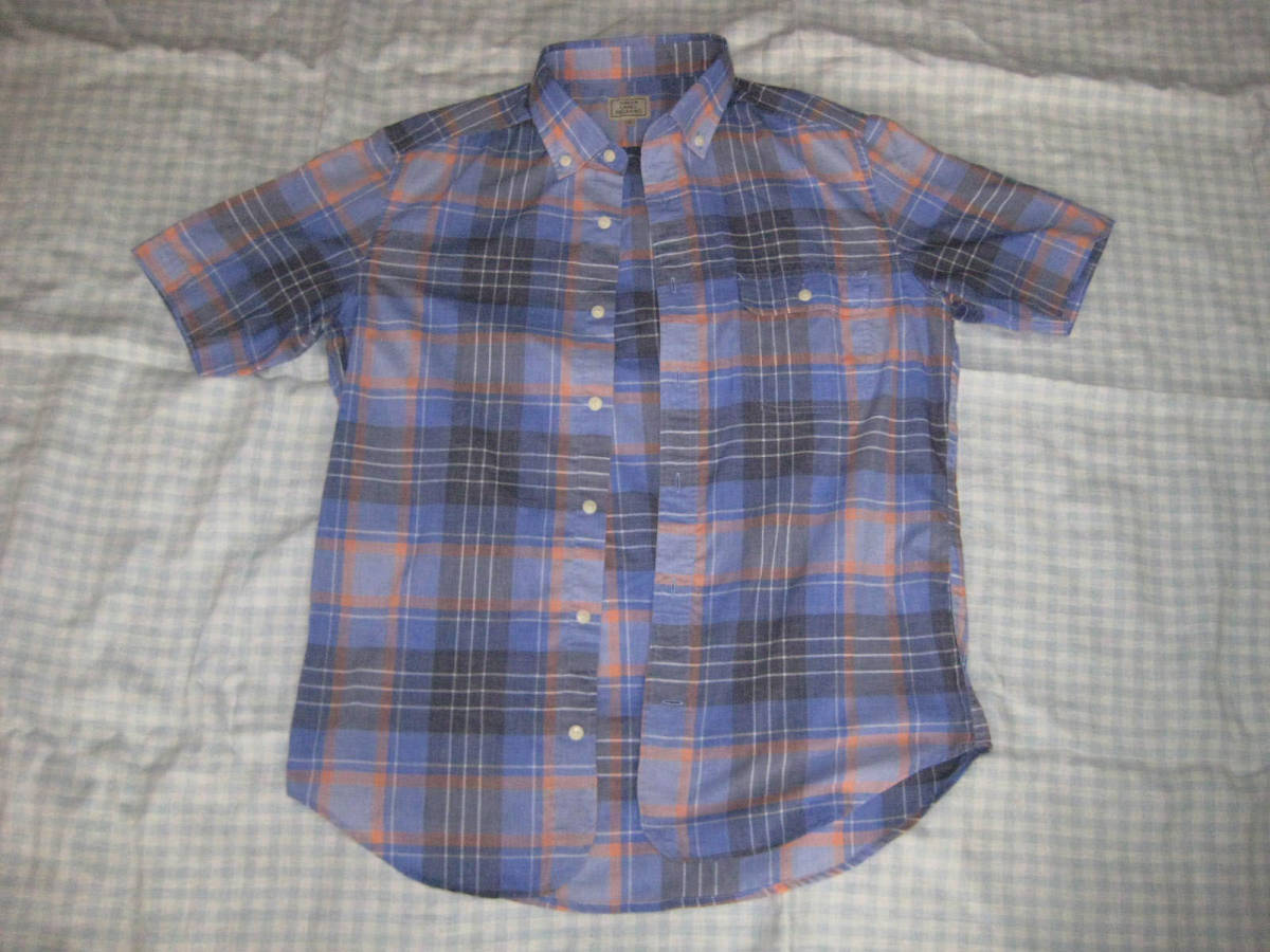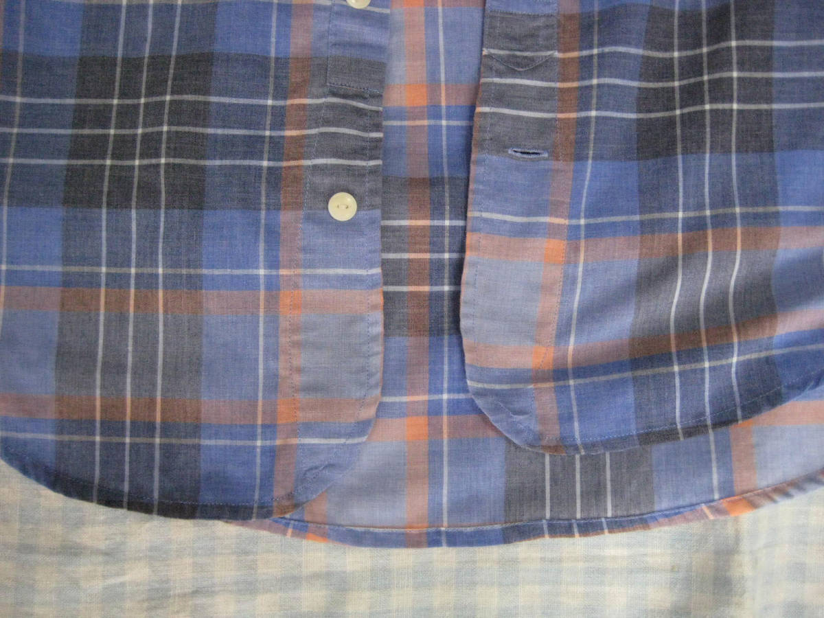 色は青とオレンジを中心としたチェック 襟ぐりが少し白っぽく見えます。画像をご覧ください。 素材:ポリエステル65%綿35% サイズL 肩幅45cm胸幅54cm袖丈25cm着丈73cm 他にも洋服、バッグ、靴、小物、本を出品していますので見てください。