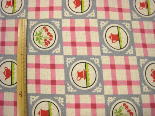 かわいらしいチェック柄、綿麻キャンバス生地が特価。ポットやさくらんぼなど、キッチンアイテムにピッタリの柄です。お料理が楽しく、おいしくなりそうな、シンプルで可愛らしい柄でエプロンや、小物など、お買い物など気軽に使えるバック等や、テーブルクロス、敷物等にもお薦めです。