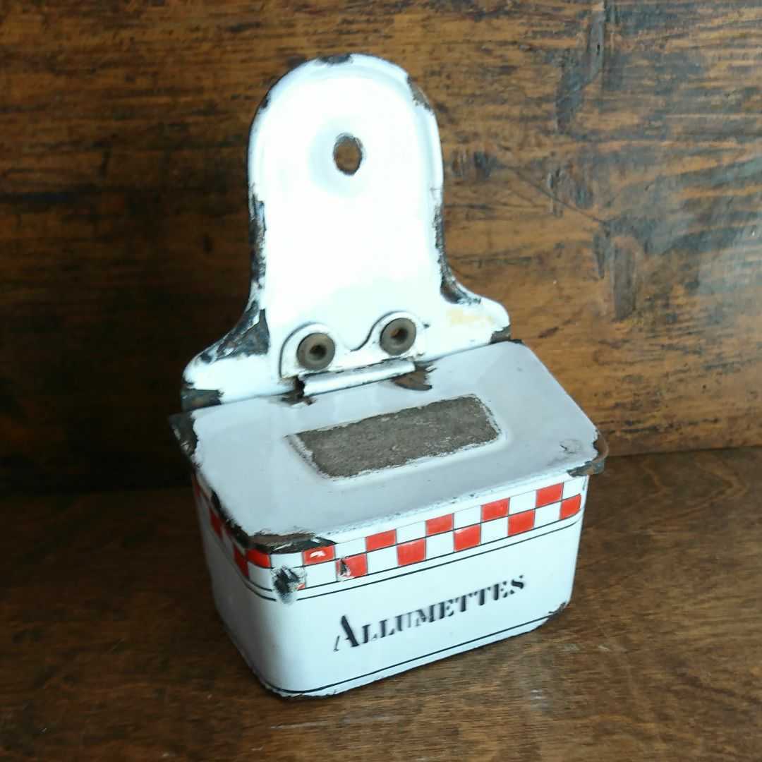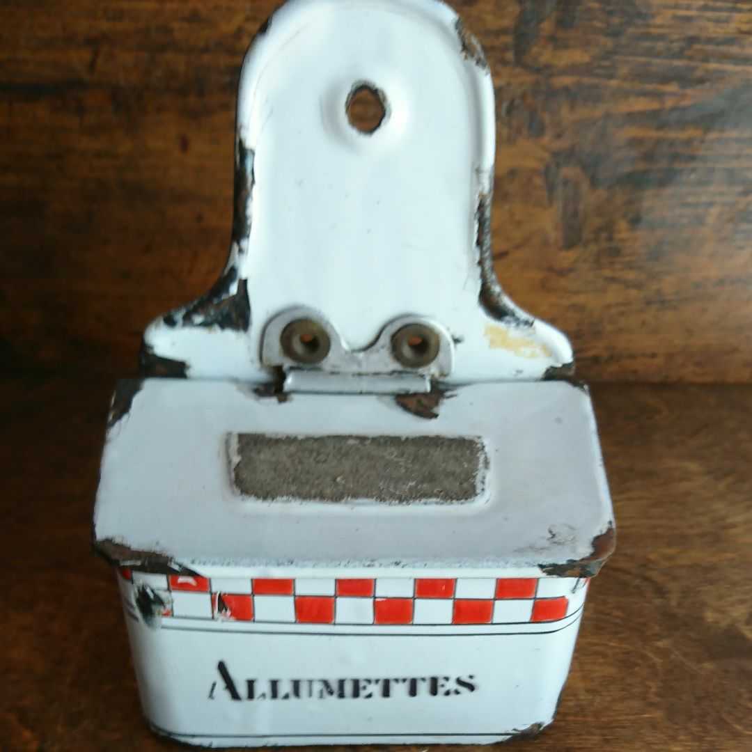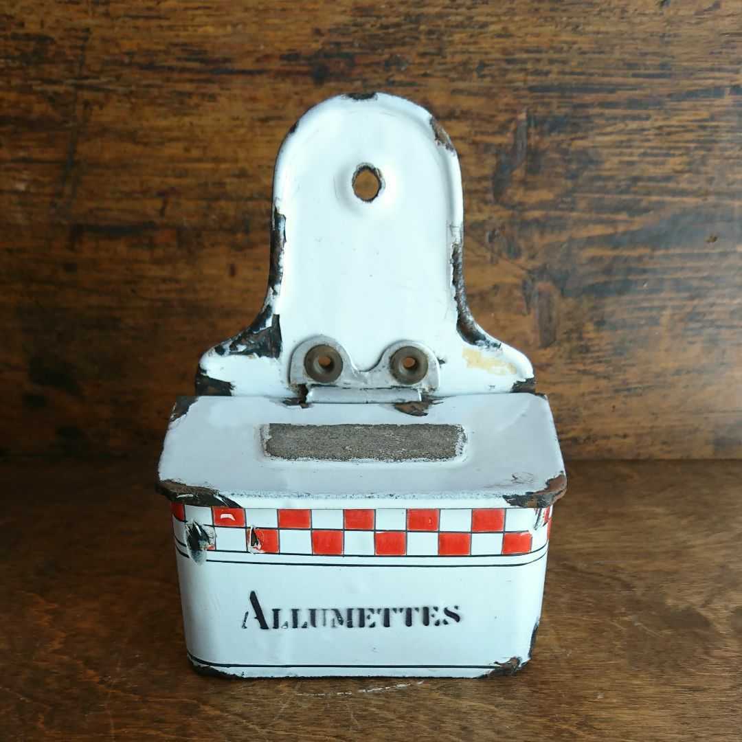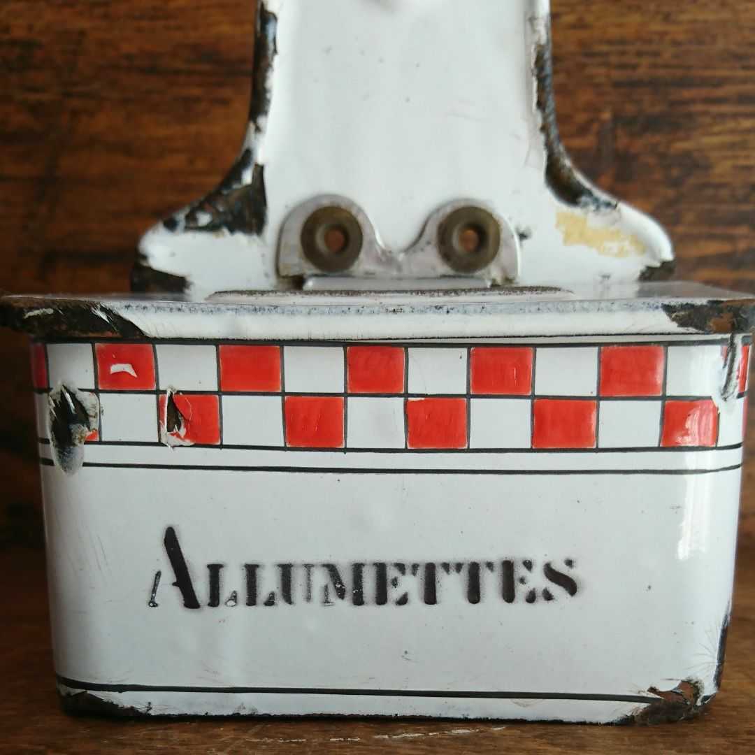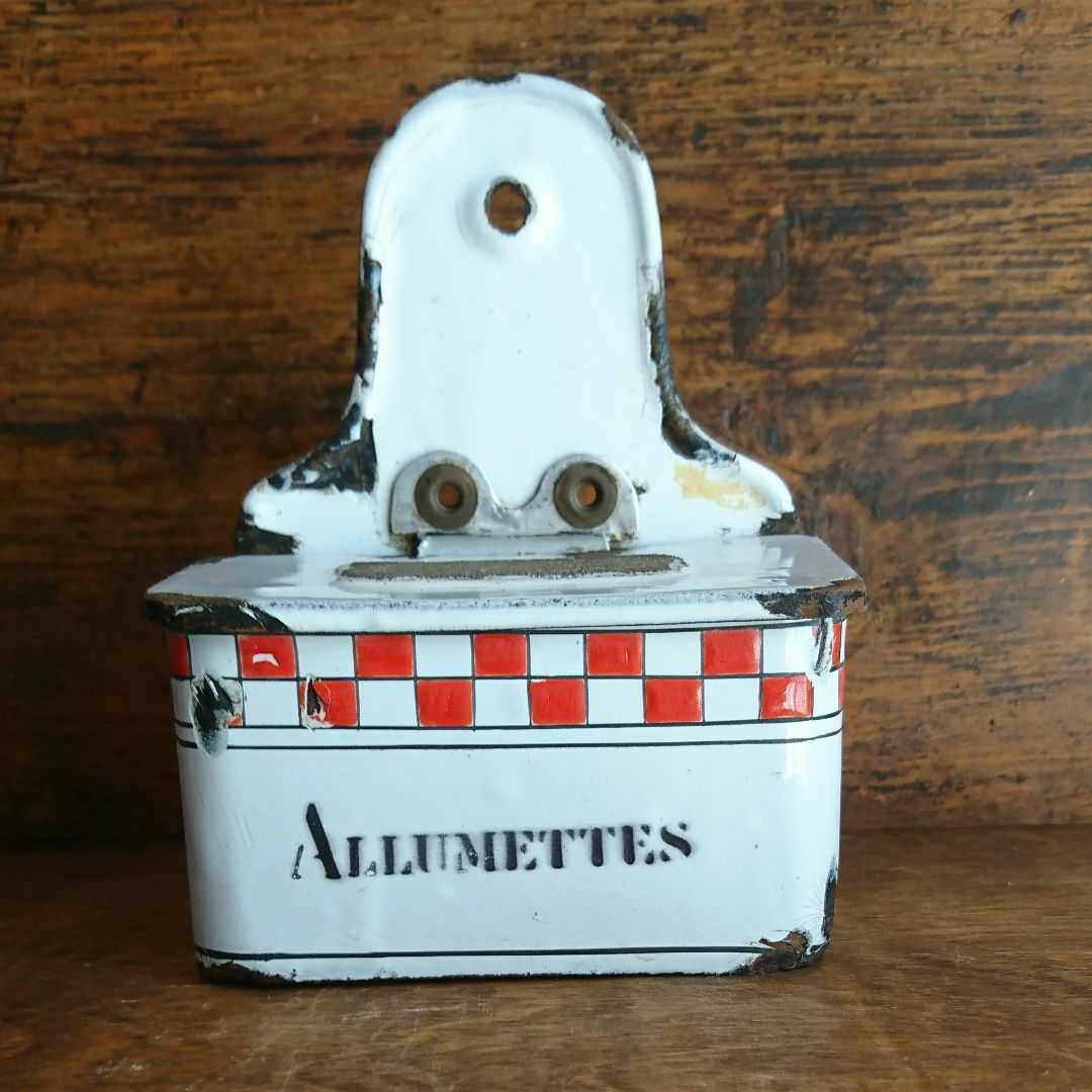 「ALLMETTES」の文字の上の赤白の市松模様がかわいらしいです。赤色部分は少し盛り上がっています。当時、蓋のザラザラした灰色の部分にマッチを擦って使っていました。文字の部分はエンボス加工になっています。