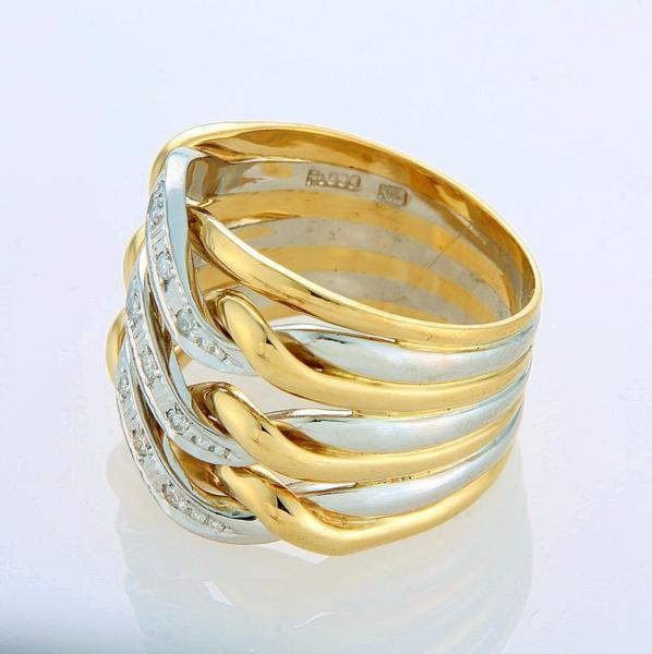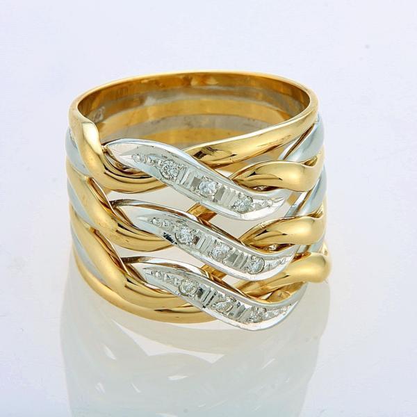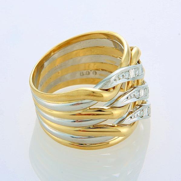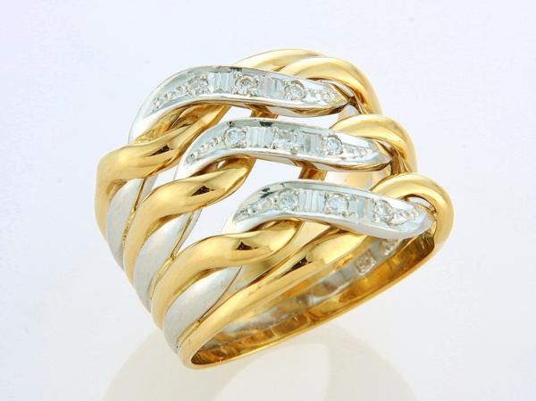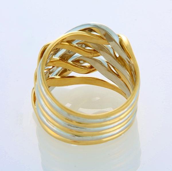 プラチナとゴールドが交互に重なり、ダイヤと織り成すデザインがとても素敵です。