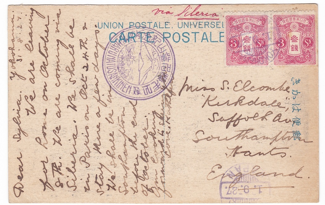 欧文櫛型印 YOKOHAMA/1.9.27/JAPAN