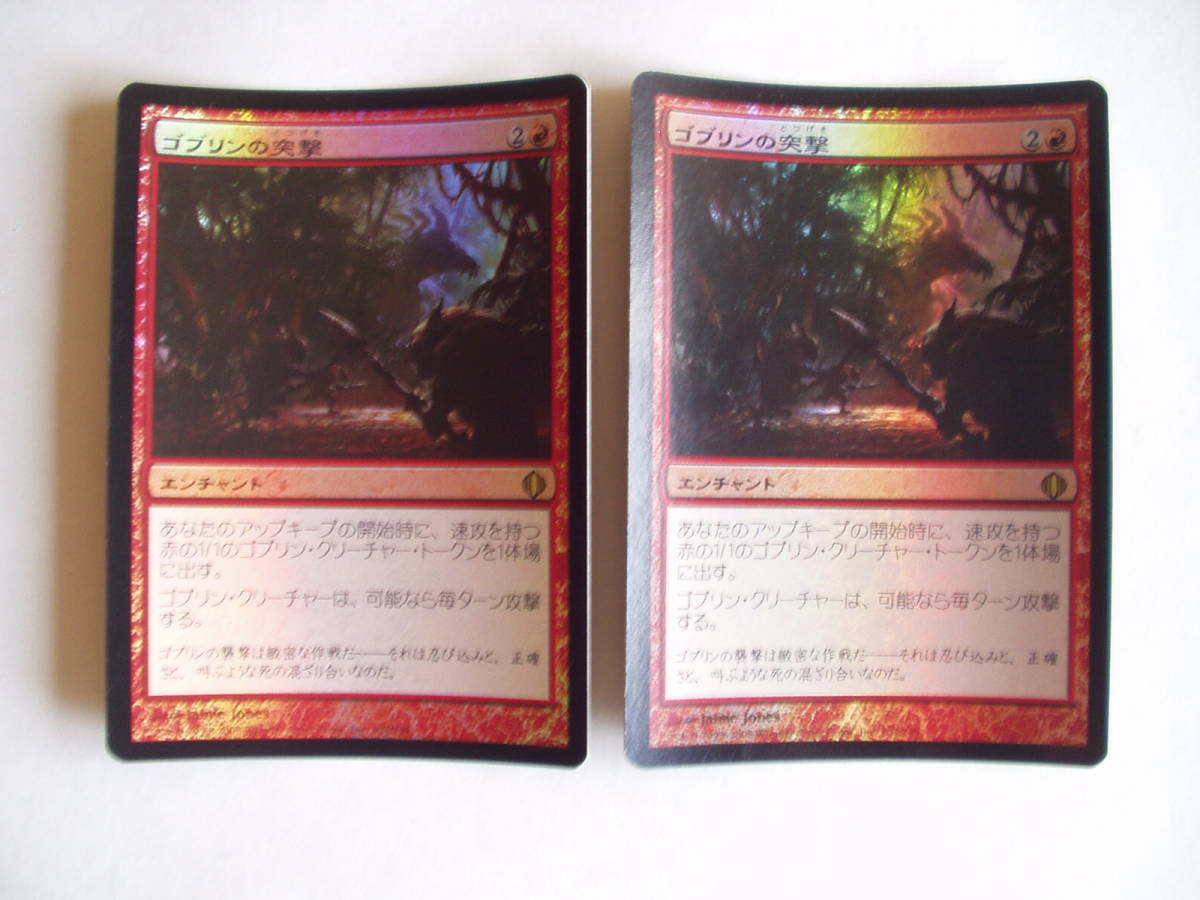 B知人の委託品です。 画像が全てです。 MTG ゴブリンの突撃/Goblin Assault foil 日本語2枚 です。 何語だか分らない時があります。 エキスパンション、外国語(言葉)は画像で確認をお願いします。 カードはプレイしてます。 程度はカードに目立つ擦り傷、傷、シワ、折れ目、ペン跡のようなキズ、汚れ、角や端に傷、黒枠にキズ、などのキズが結構あります。 カードからタバコ、香水の匂いがします。 カードが丸まっていたり反ってたりしています。 気が付かない部分がありますので程度を気にする方は入札をご遠慮下さい。 程度はボロ、ジャンクです。 コレクションには向きません。 何か起きた場合には自分では対応が出来ませんのでご理解頂ける方のみ入札をお願いします。 普通郵便で発送します。 郵便事故や郵便破損が起きた場合には保障できません。 ノ-クレーム、ノーリターンでお願いします。 ●クロネコメール便は2015/3/31で発送が出来なくなりました。ご了承下さい。