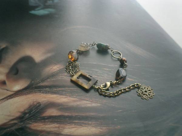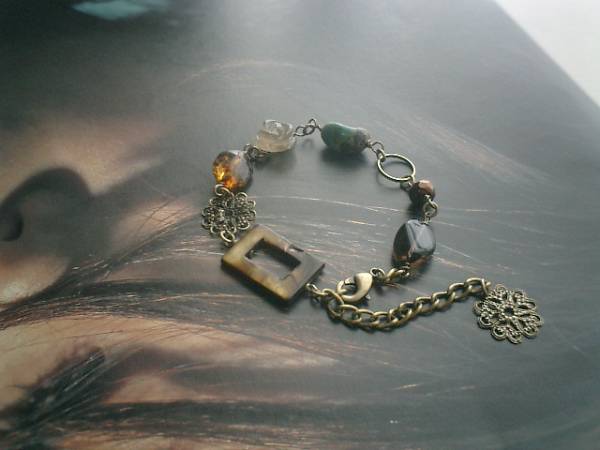 カワイイと可愛いの間に・・シリーズです♪シックなターコイズ・・繊細な素材を合わせて可憐な表情のブレスレットです♪ターコイズは13ミリ位のラフカットです♪ブラウンやベージュの入ったやさしい色のターコイズにツイストオーバルや薔薇のスモーキークォーツや琥珀色のデザイン樹脂やシェルスクエアやチェコビーズや透かしチャームを合わせて大人のロマンチックしています♪長さは全長24センチ位で調節自由です♪♪お揃いのネックレスも出品しています♪♪シンプルで飽きのこないいつまでも着けられるデザインを考えて作りました!ハンドメイドをご理解頂いてノークレーム、ノーリターンでお願いします
