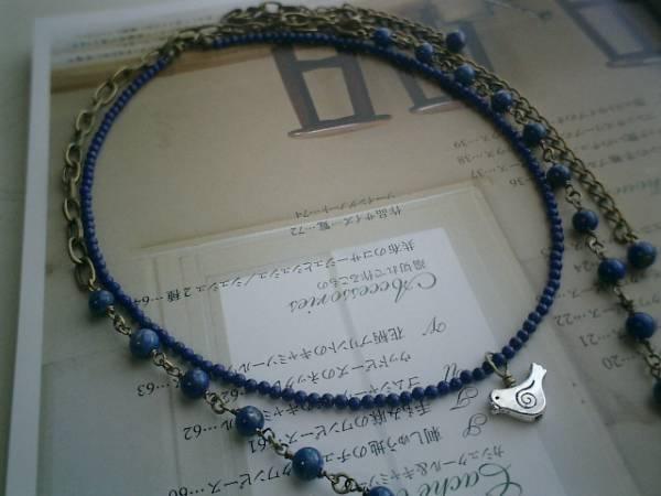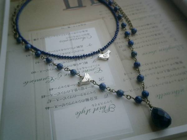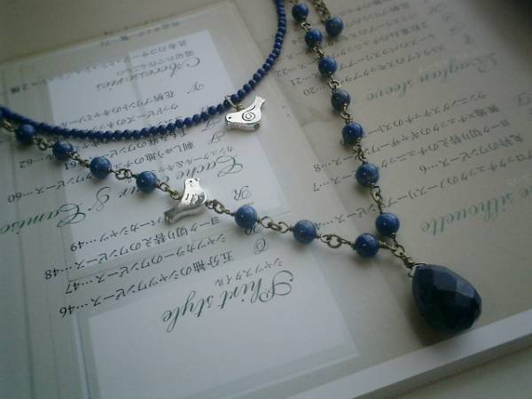 可憐なシルエット・・シリーズです♪シックな藍色のラピスラズリとソーダライトのネックレス2点セットです♪キュートで合わせやすいデザインです♪繊細な3ミリの丸玉のラピスラズリのトップは14×8ミリ位の小鳥さんのメタルチャームです♪取り外しが出来ますのでシンプルなデザインでも楽しんでいただけます♪長さは40センチ+アジャスター10センチで最長50センチ位です♪6ミリの丸玉のソーダライトのトップは18×13ミリ位のラピスラズリのドロップカットです♪小鳥さんを合わせて大人のロマンチックしています♪長さは全長74センチ位で調節自由です♪それぞれ単品やお揃いのブレスレットやピアスも出品しています♪シンプルで飽きのこないいつまでも着けられるデザインを考えて作りました!ハンドメイドをご理解頂いてノークレーム、ノーリターンでお願いします