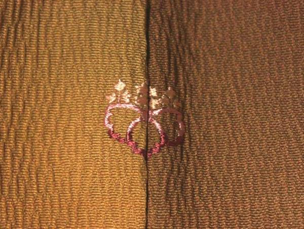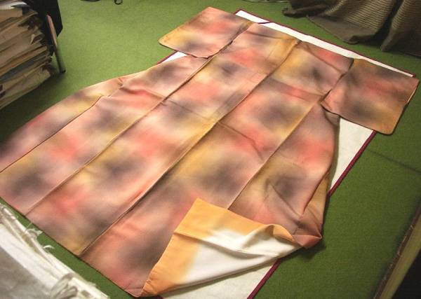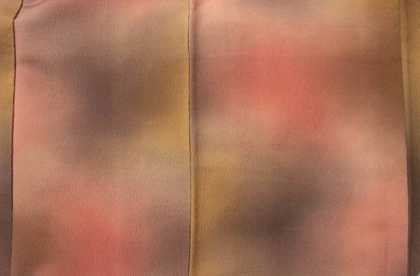 全体に桃色、黄系の暈しの地です。背中に一つ刺繍で細中陰五三桐紋です。お洒落なデザインです。