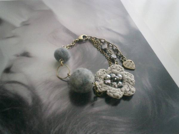 ガールズ・ファッションシリーズです♪ロマンチックグレー気分・・物憂げなグレーでまとめたブレスレットです♪パープルグレーの淡水パールは4ミリから6ミリ位までのバロックです♪26ミリ位の編みフラワーやフェルト玉を合わせて大人可愛いデザインです♪長さは全長23センチ位で調節自由です♪お揃いのブレスレットやネックレスも出品しています♪♪シンプルで長く着けていただけるデザインを考えて作りました♪ハンドメイドをご理解頂いてノークレーム、ノーリターンでお願いします