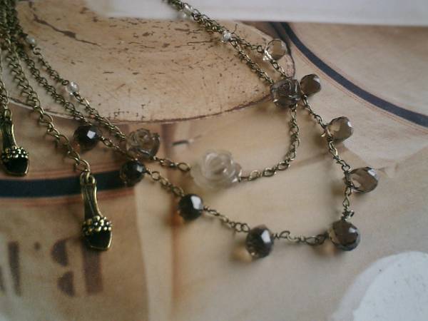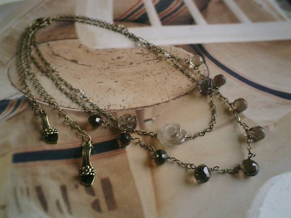 パリの屋根裏部屋シリーズです♪神秘的なスモーキークォーツのネックレス2本セットです♪シックにまとめました♪スモーキークォーツの薔薇は10ミリから14ミリ位までの大きさ違い、お色違いです♪4ミリのスモーキークォーツの丸玉と合わせました♪濃淡のある薔薇が可憐で可愛いです♪長さは全長53センチ位で調節自由です♪キュートなスモーキークォーツのドロップは9×7ミリ位です♪繊細なカットが素敵です♪長さは全長53センチ位で調節自由です♪どちらもチョーカー風に着けたり画像のようにブレスレットにしたりいろいろな組み合わせでお楽しみ頂けます♪パリの屋根裏部屋をイメージして作りました♪シンプルで飽きのこないいつまでも着けられるデザインを考えて作りました!ハンドメイドをご理解頂いてノークレーム、ノーリターンでお願いします