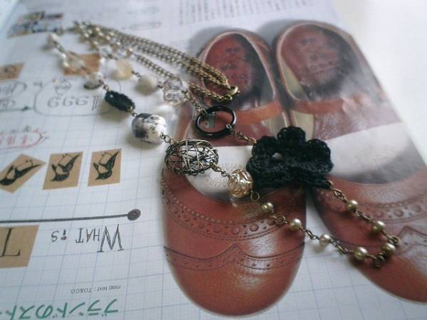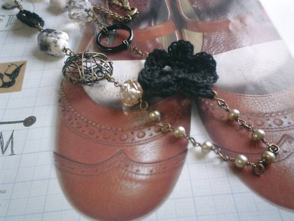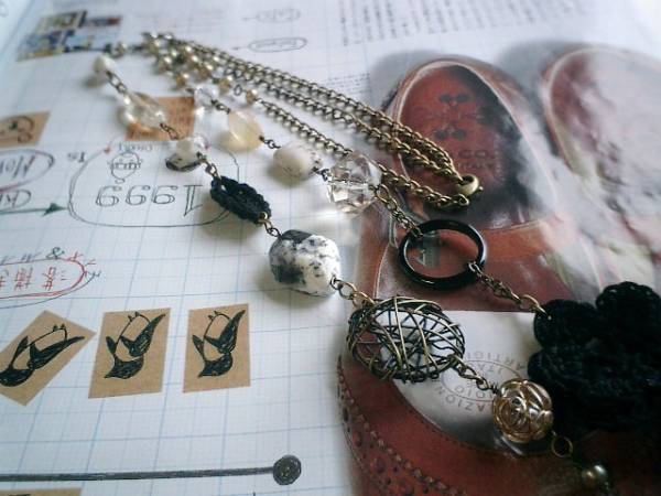 春色モード入ります・・シリーズです♪モノトーンの異素材を集めたネックレスです♪黒の編みフラワーは40ミリ位です♪8ミリのラウンドカットの水晶や22ミリ位のシトリンのマーキスや10×14ミリのレクタングル、10ミリのラフカットのホワイトアゲートや19ミリのオニキスリングや20ミリのデンドライトアゲートや4ミリ位のシャンパンベージュの淡水パールや24ミリのワイヤーボールや薔薇の樹脂ビーズを集めてロマンチックにまとめました♪長さは全長97センチ位で調節自由です♪2連にされても素敵です♪シンプルで飽きのこないいつまでも着けられるデザインを考えて作りました!お揃いのブレスレット、同じシリーズの作品も出品しています♪ハンドメイドをご理解頂いてノークレーム、ノーリターンでお願いします
