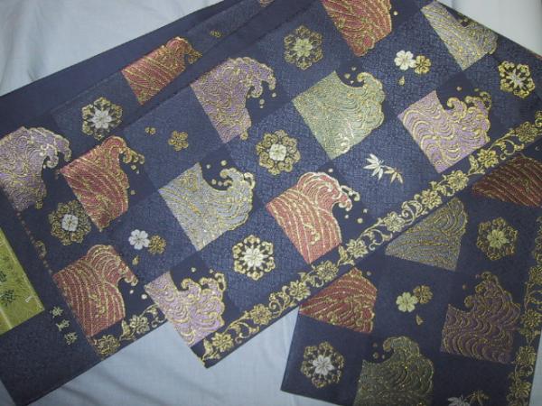 質問などはお気軽にしてください。 なお、帯柄左上に無地で出ているところは裏無地で、柄と柄の間に出ているところは手先と前太鼓のあいだの無地部分です。6通柄です。金銀糸が多用されているためストロボの照りで、しろぽく写っている部分があります