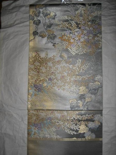 格調高い訪問着にどうぞ!帯です。おもに訪問着用帯です じゅらく 『。。。』ブランド 西陣6通柄帯 絹100%金属糸等使用   新品み仕立て品 薄金~銀~うす灰地(裏地は白クリーム)で枯れ草、薄紫、こいめ水、、金、濃い灰、白クリームなどで柄。期間限定で芯仕立てサービスの場合の期間もあります