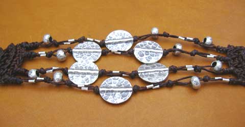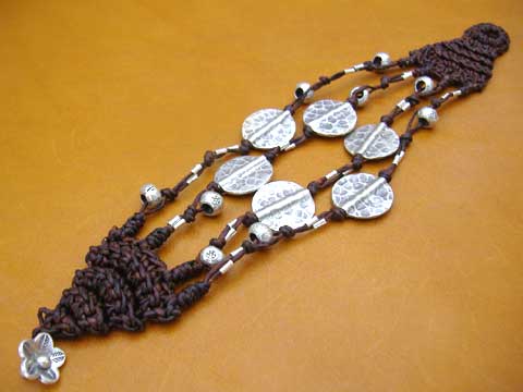 ◆カレン族シルバーブレスレット マクラメ茶11・4連◆円形ビーズ |