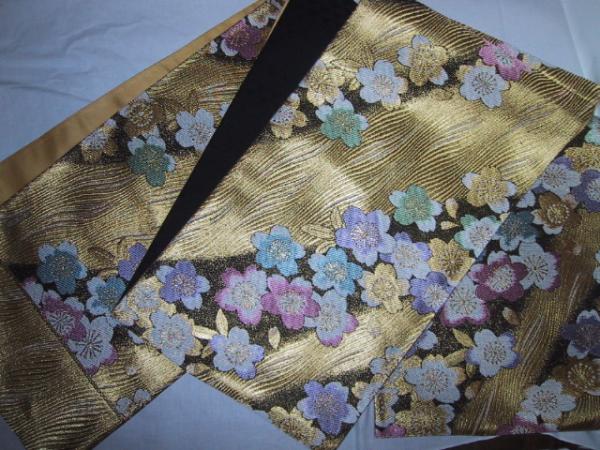 黒金+金地(裏地は金茶)、、かいきり(たれ先柄立ち上がり)~かいきりなし(手先柄はし)まで約456,0cmですので、出来上がり予想は約450cmです。巾31,0cm