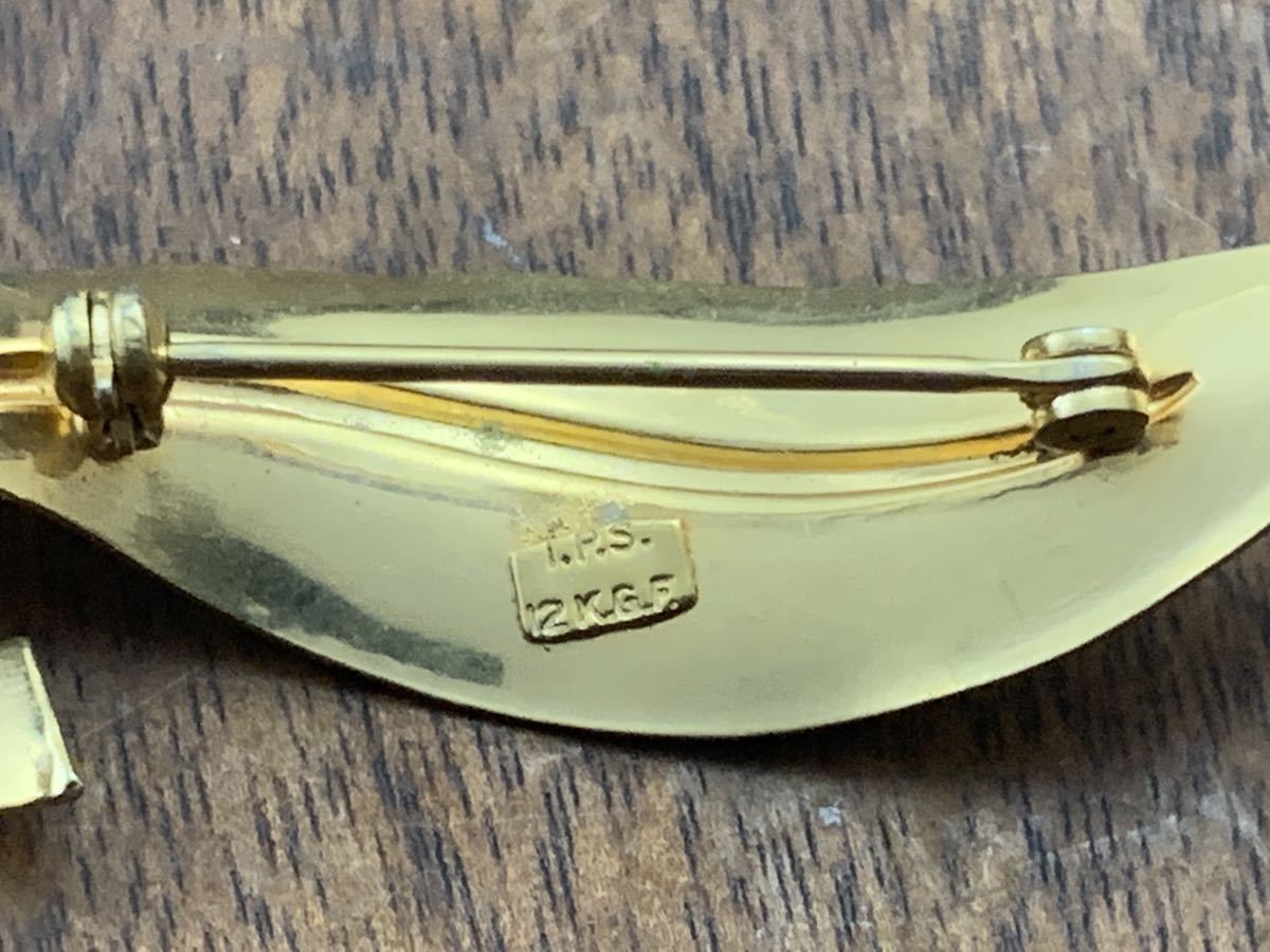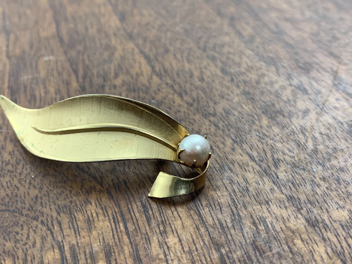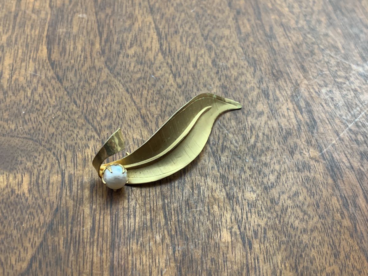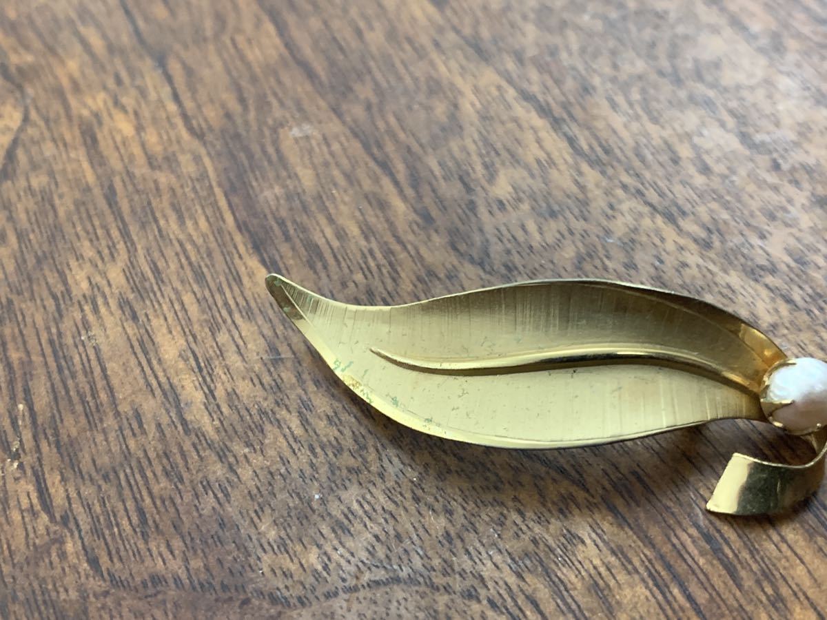 【送料無料】12kgfレトロ リーフ 葉っぱ ゴールド調 イミテーションパール ブローチ ヴィンテージ 中古