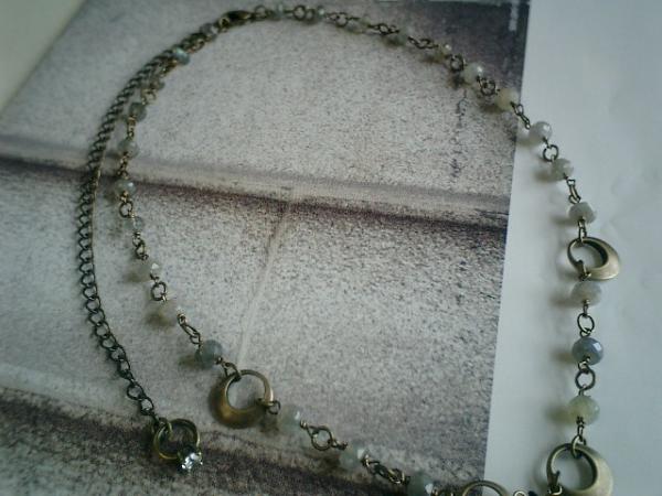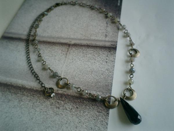 映画の余韻!ひっそり美しいネックレスです♪オニキスとラブラドライトのアンティークっぽいシックなネックレスです♪ラブラドライトは6×4ミリ位のボタン型でトップのオニキスは26×10ミリ位のドロップ型です♪シックで存在感があります♪間にアンティークチャームを挟んでいます♪シンプルなデザインなのでいろいろなシーンで着けていただけます♪♪長さは全長53センチ位で調節自由です♪短くチョーカー風にも着けても可愛いです♪お揃いのブレスレットも出品予定です。ハンドメイドをご理解頂いてノークレーム、ノーリターンでお願いします