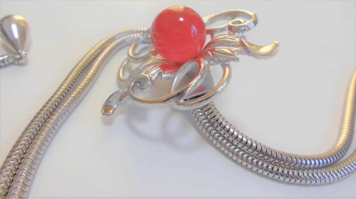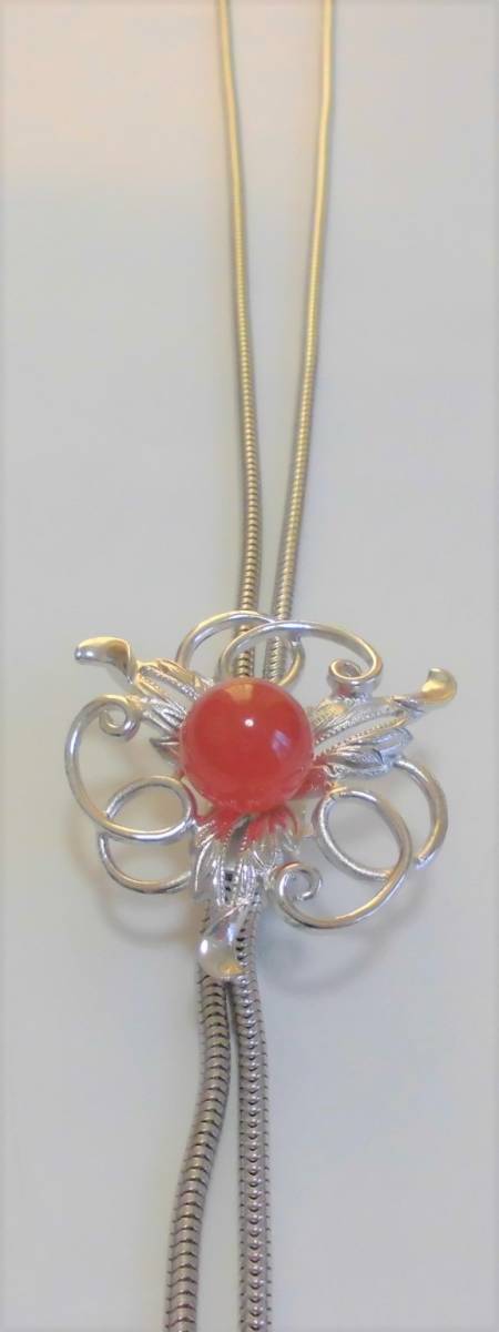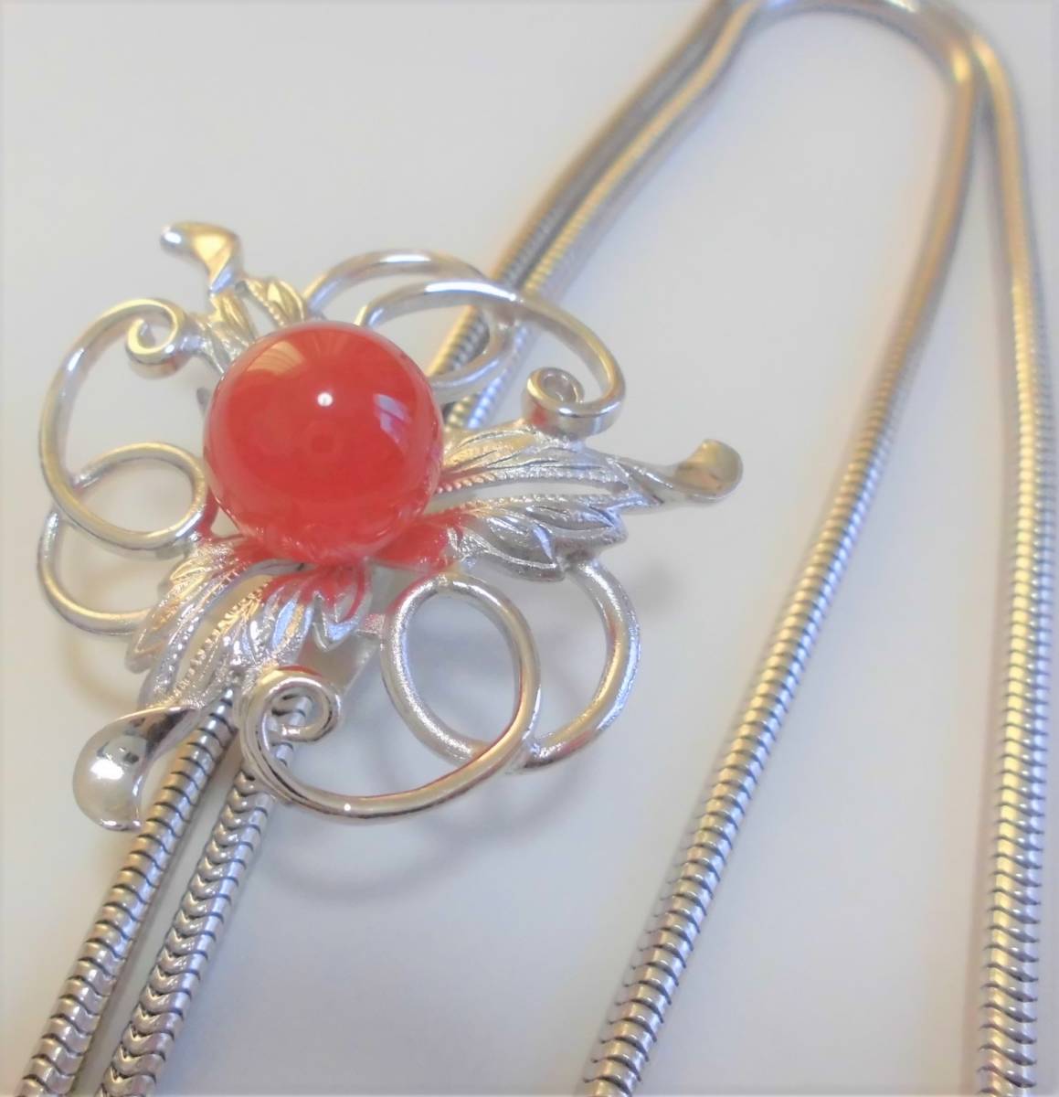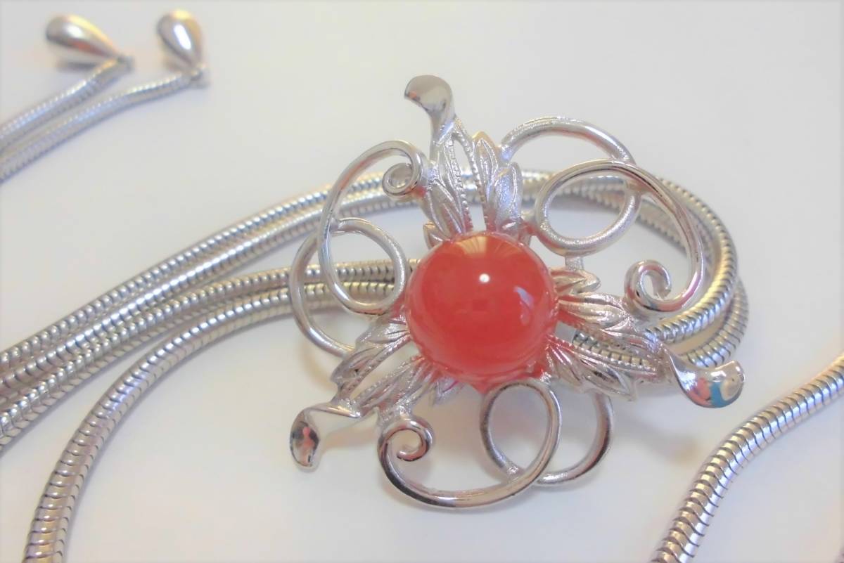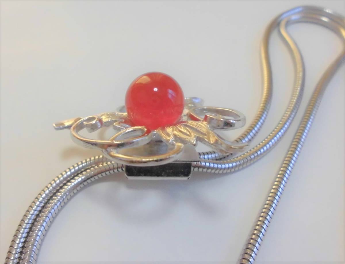 銀色の蔓唐草と葉の台に赤い瑪瑙の玉のついたループペンダントです。