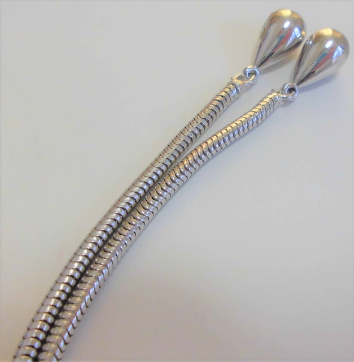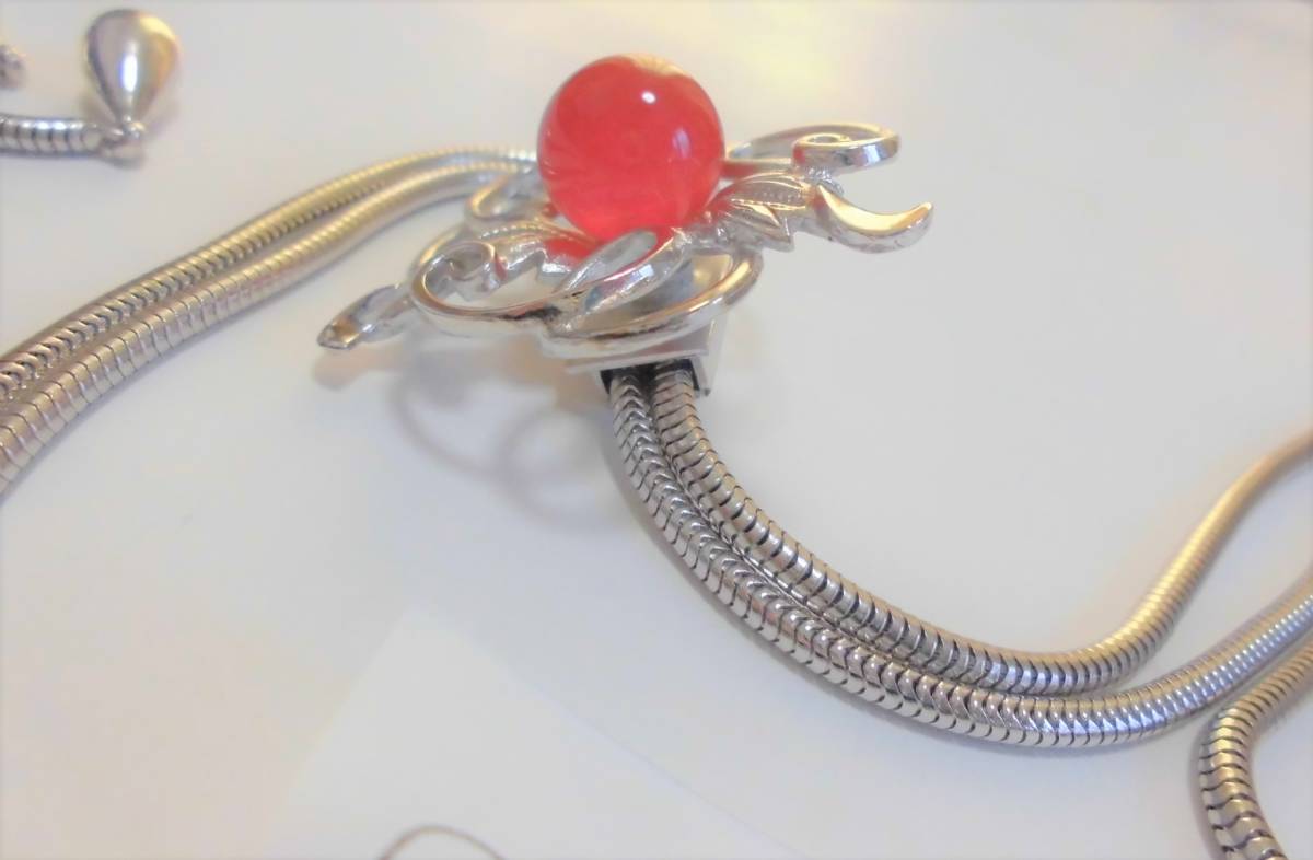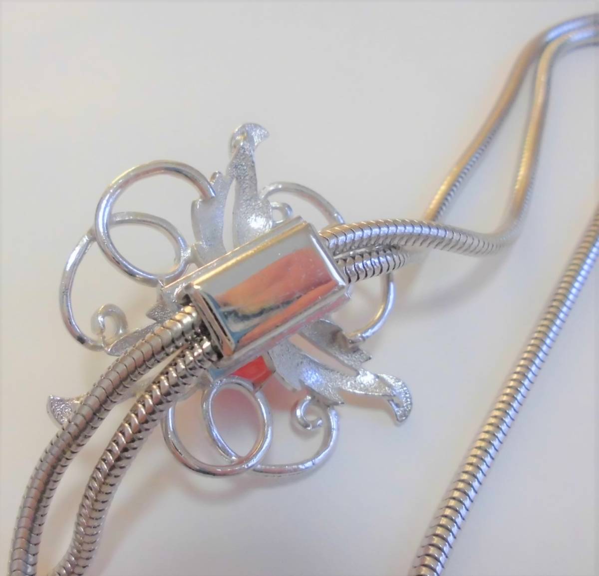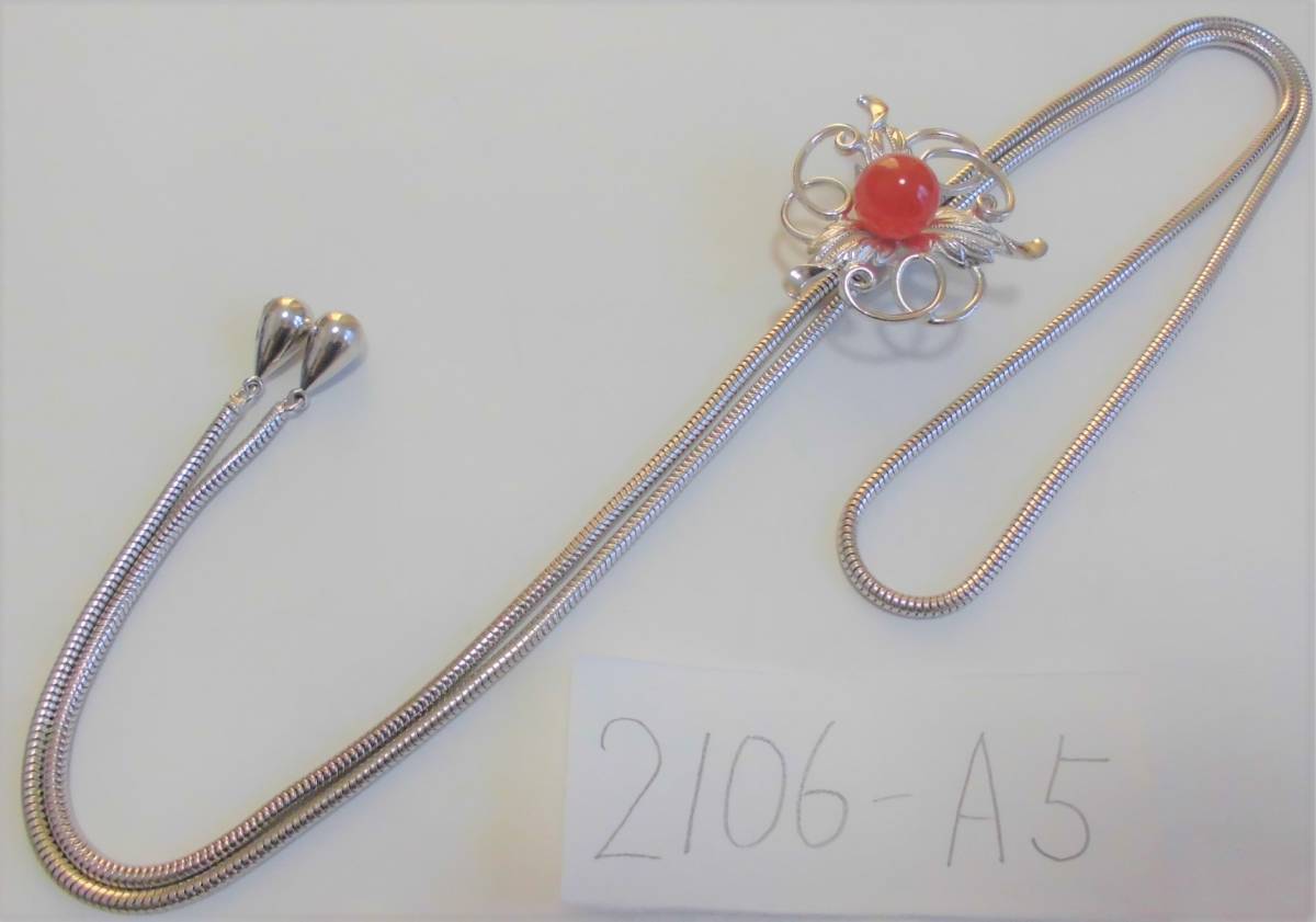 銀色の蔓唐草と葉の台に赤い瑪瑙の玉のついたループペンダントです。