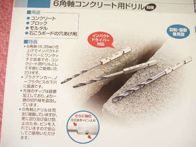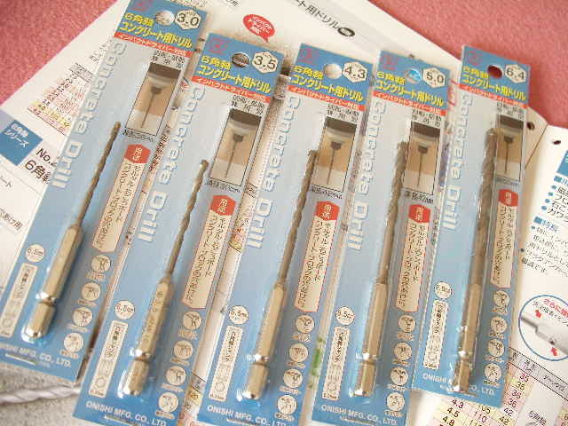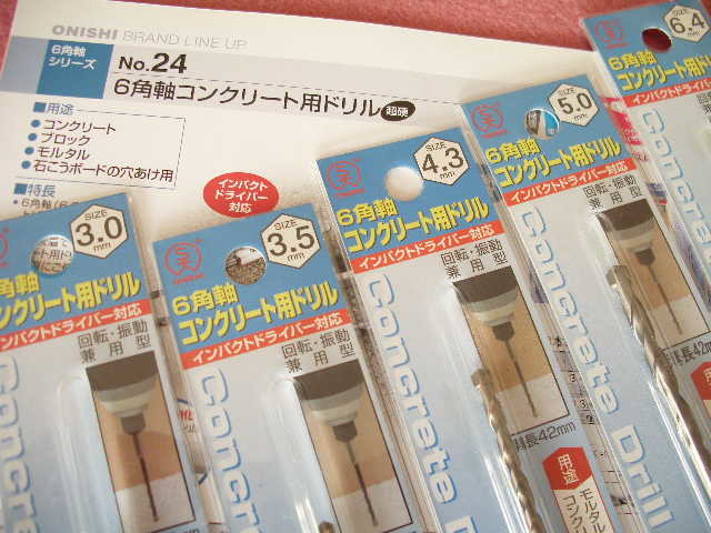 大西工業㈱製品 六角軸コンクリート用ドリル 5本セット ノープラスビス用のブロック、コンクリート等の下穴開けに最適です。 超硬ドリル! インパクトドライバーにワンタッチで装着でき使用出来ます。回転用、打撃振動用兼用ドリル。 ★合計定価5,423円★ 新品未使用。 発送は、全国一律210円発送対応です。 | |||
