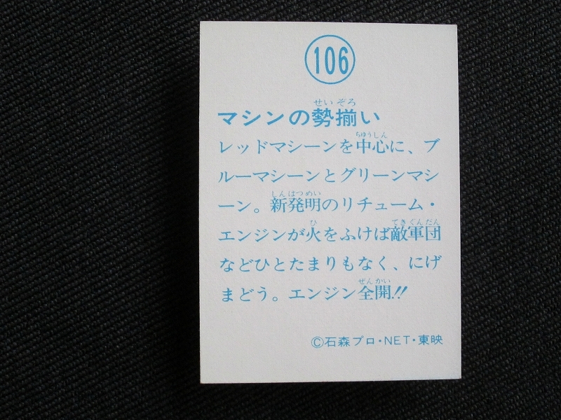 秘密戦隊ゴレンジャー ミニカード 70年代 バラ売り ・メーカー:山勝 ・1975年頃、当時の放送時に販売 ・6.6 cm x 5.0 cm ・同梱発送可能(複数落札の場合:定形、定形外郵便は、送料が変わる場合があります。) ・1-288番シリーズ ・1弾80種 001-080(タイトル違い.55.57.59.61.71.76.77,表修正.73) ・2弾32種 081-112 ・3弾64種 113-176 ・4弾48種 177-224 ・5弾32種 225-256 ・6弾32種 257-288 〓参考項目〓 ・原作石森章太郎 ・脚本上原正三 他 ・監督竹本弘一 他 ・制作テレビ朝日 ・放送期間1975年4月- 1977年3月 ・全84話 〓出演〓 ・海城剛・アカレンジャー:誠直也 ・新命明・アオレンジャー:宮内洋 ・大岩大太・キレンジャー:畠山麦 ・熊野大五郎・2代目キレンジャー:だるま二郎 ・ペギー松山・モモレンジャー:小牧りさ ・明日香健二・ミドレンジャー:伊藤幸雄 ・江戸川総司令:高原駿雄 ・陽子・007:鹿沼えり ・黒十字軍総統:安藤三男、八名信夫 ・ナレーション:田中信夫、大平透