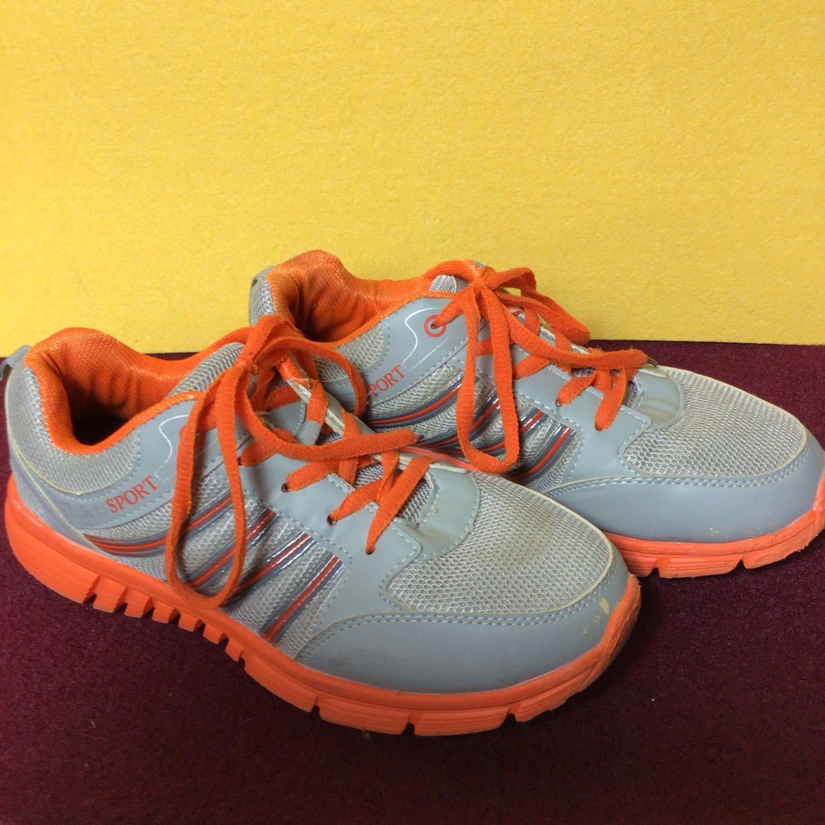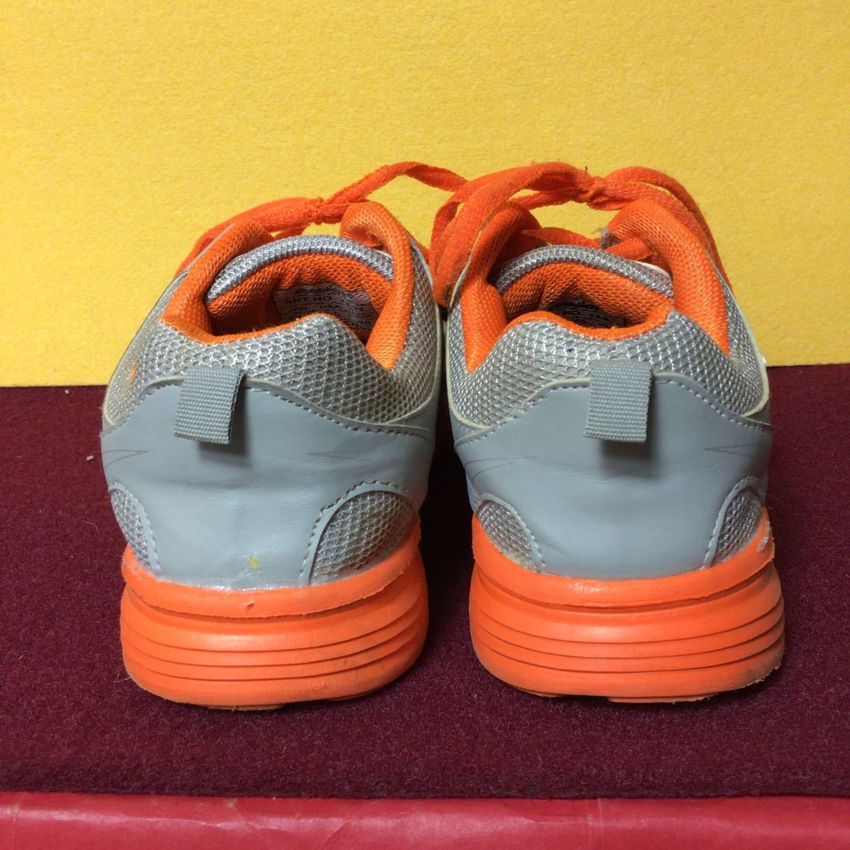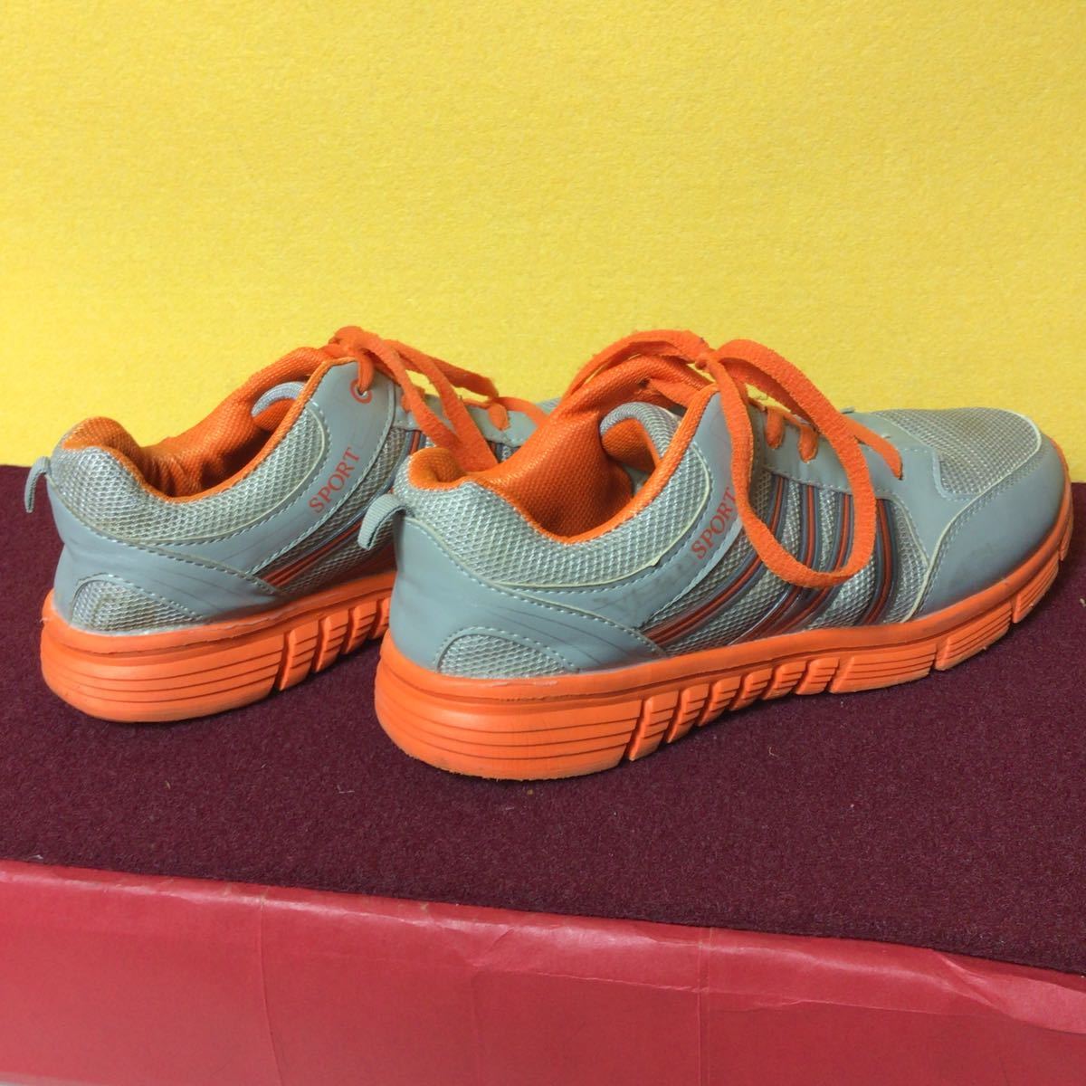 グレーにオレンジがポイントのランニング、ウォーキングシューズとなります。24.5cmなので男女問わず履いていただけるかと思います。
