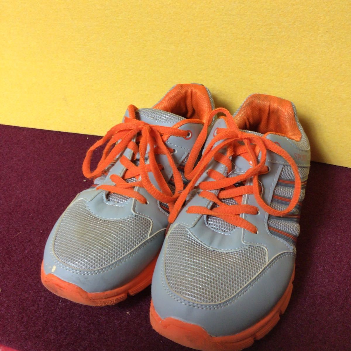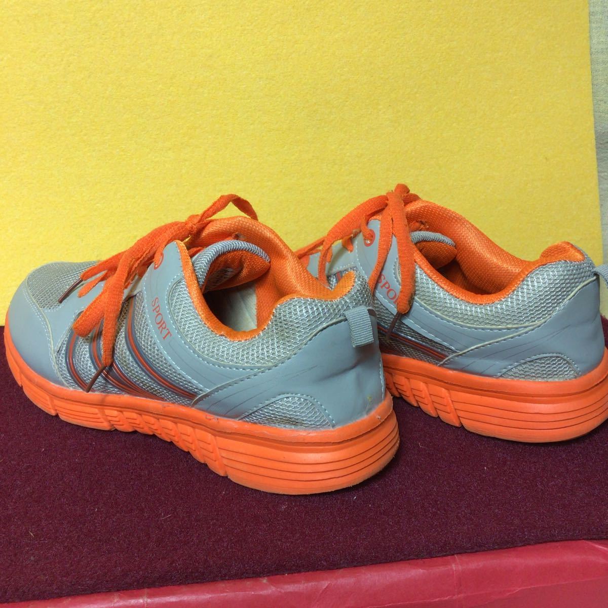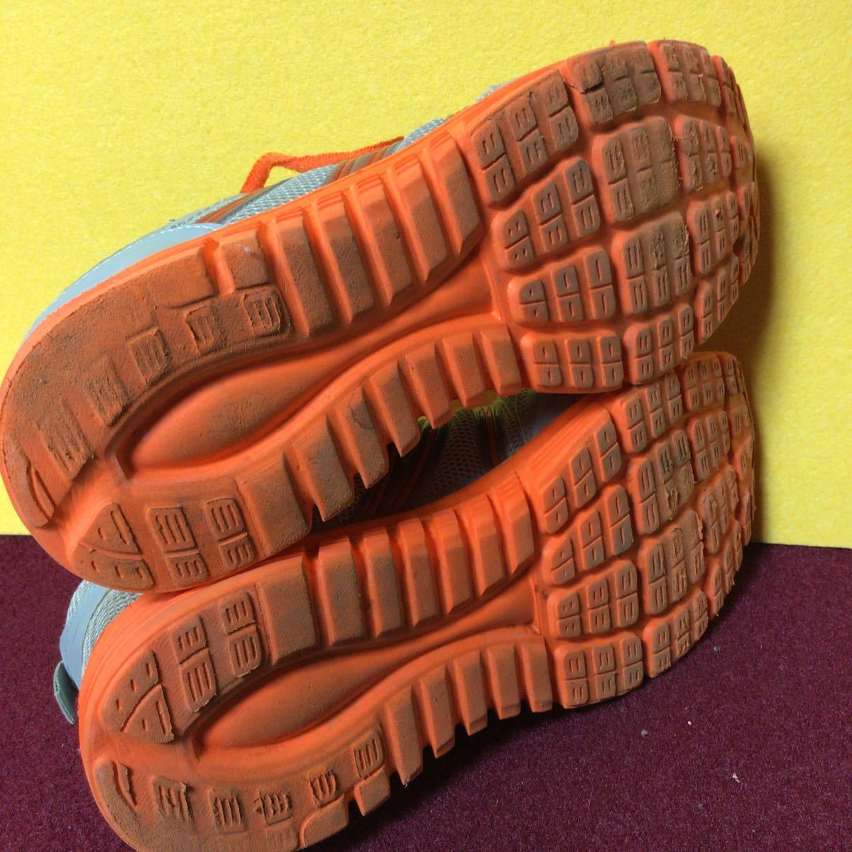 グレーにオレンジがポイントのランニング、ウォーキングシューズとなります。24.5cmなので男女問わず履いていただけるかと思います。