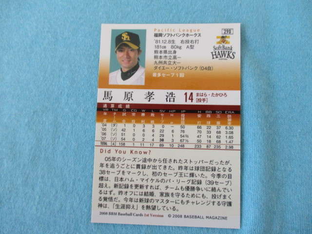 ★BBM 2008★1st Version〔290 馬原孝浩 福岡ソフトバンクホークス〕トレカ♪
