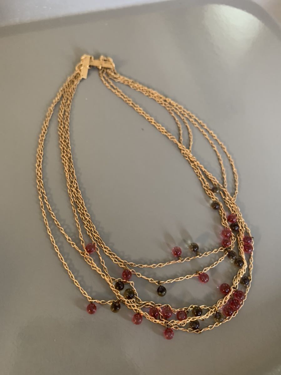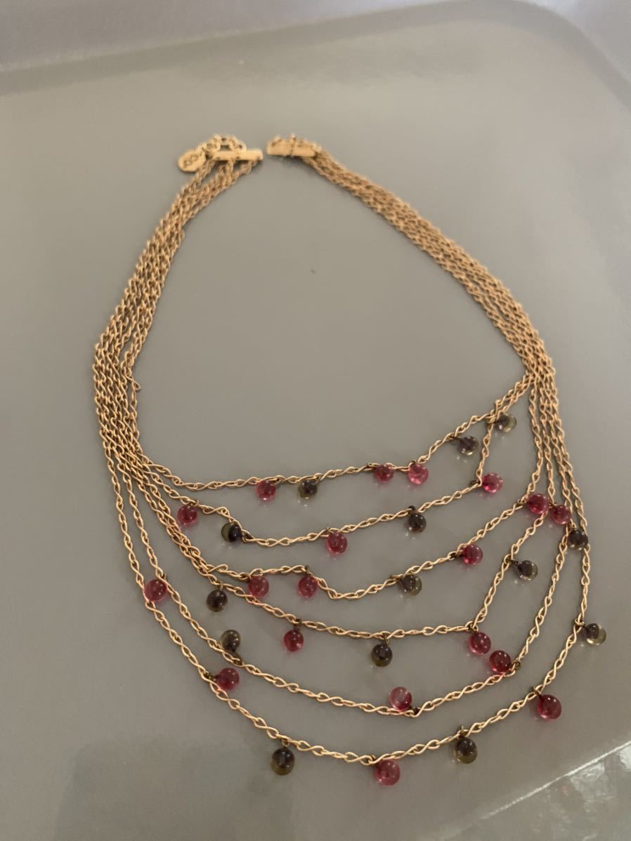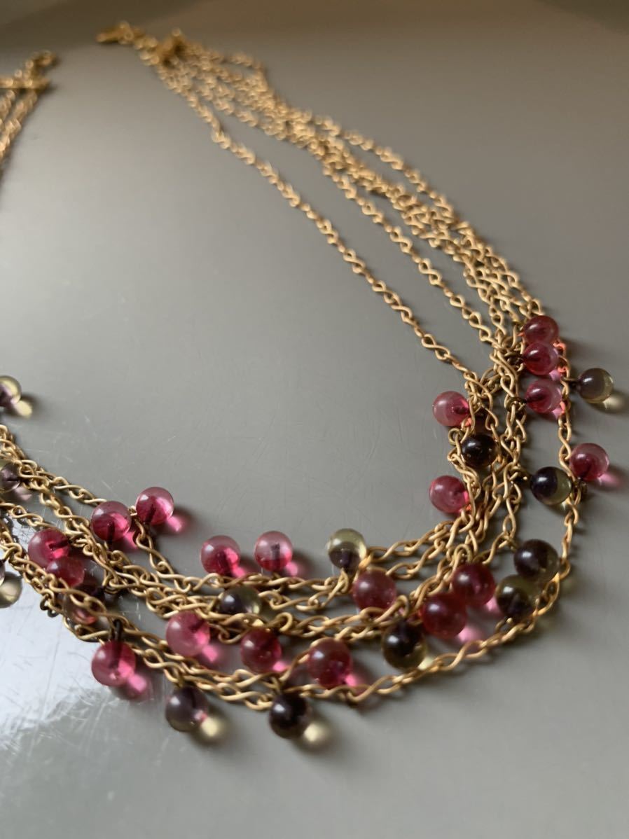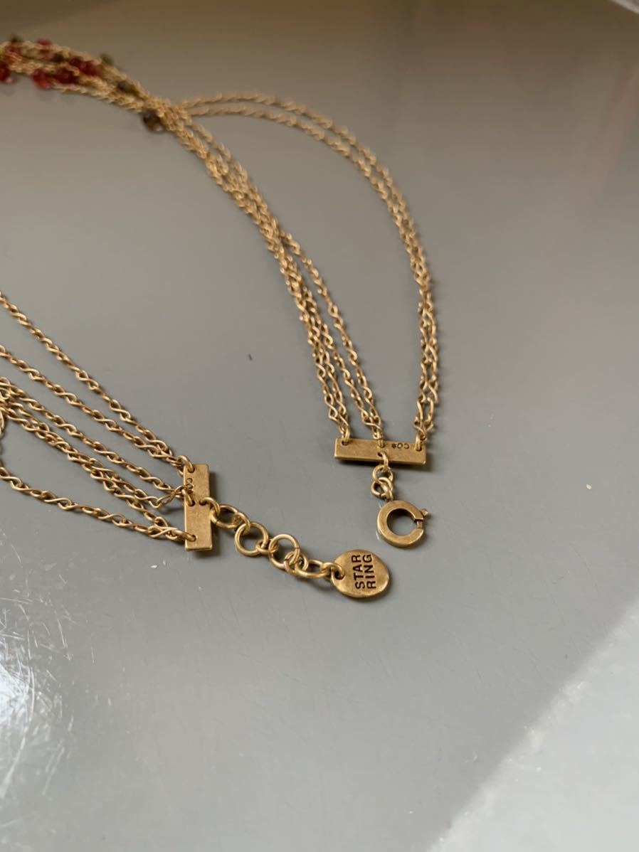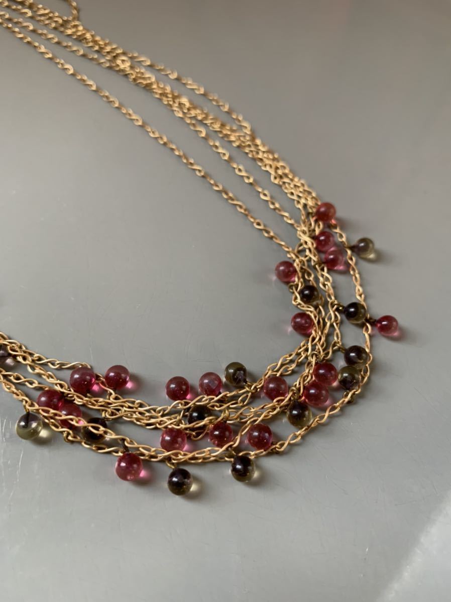 コスターリングのネックレスです。ゴールドの6連チェーンにランプワークガラスが付いた繊細なデザインです。ガラスの内部は二重になっていて凝っています。