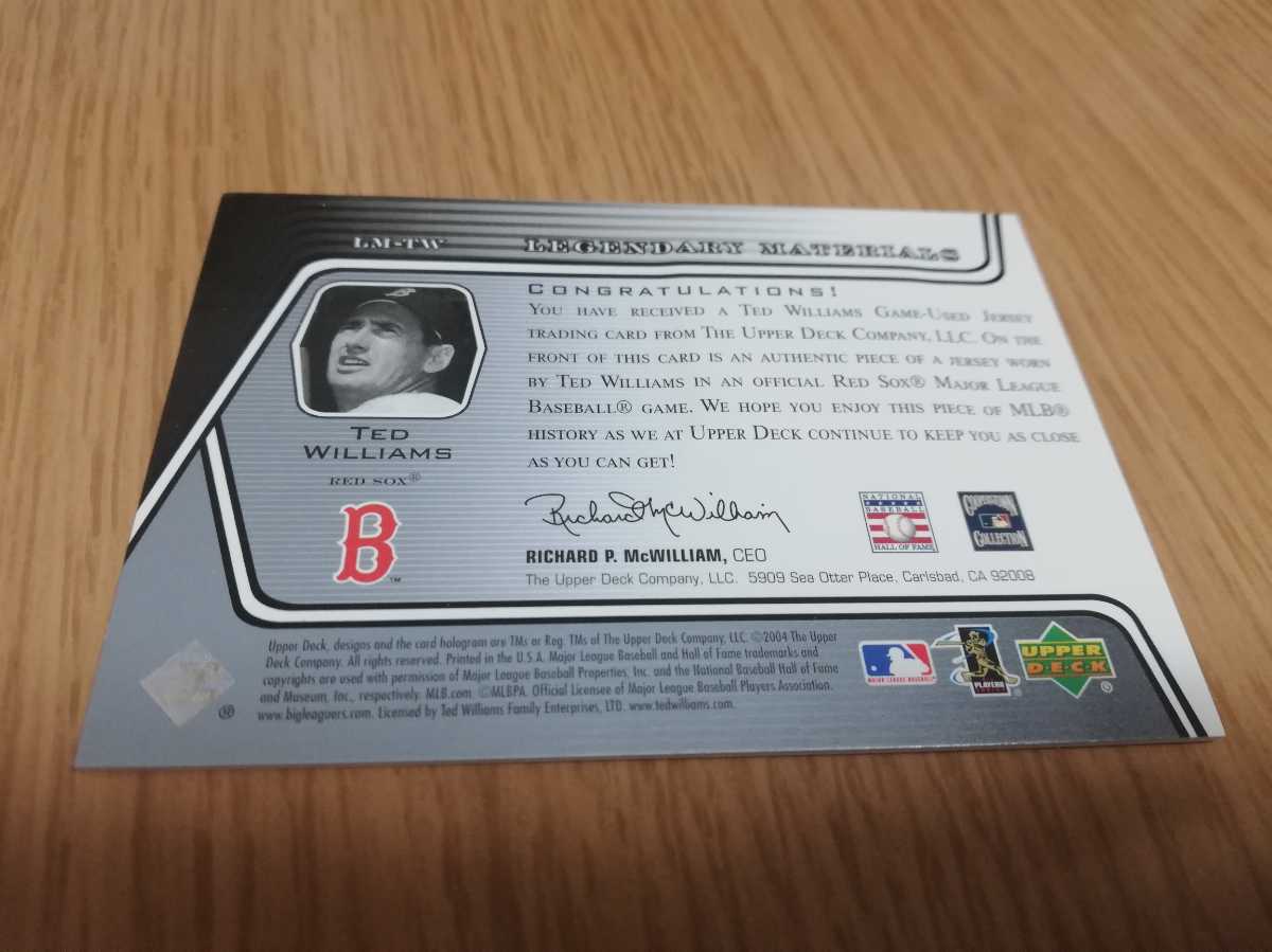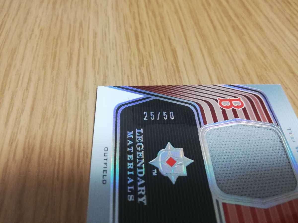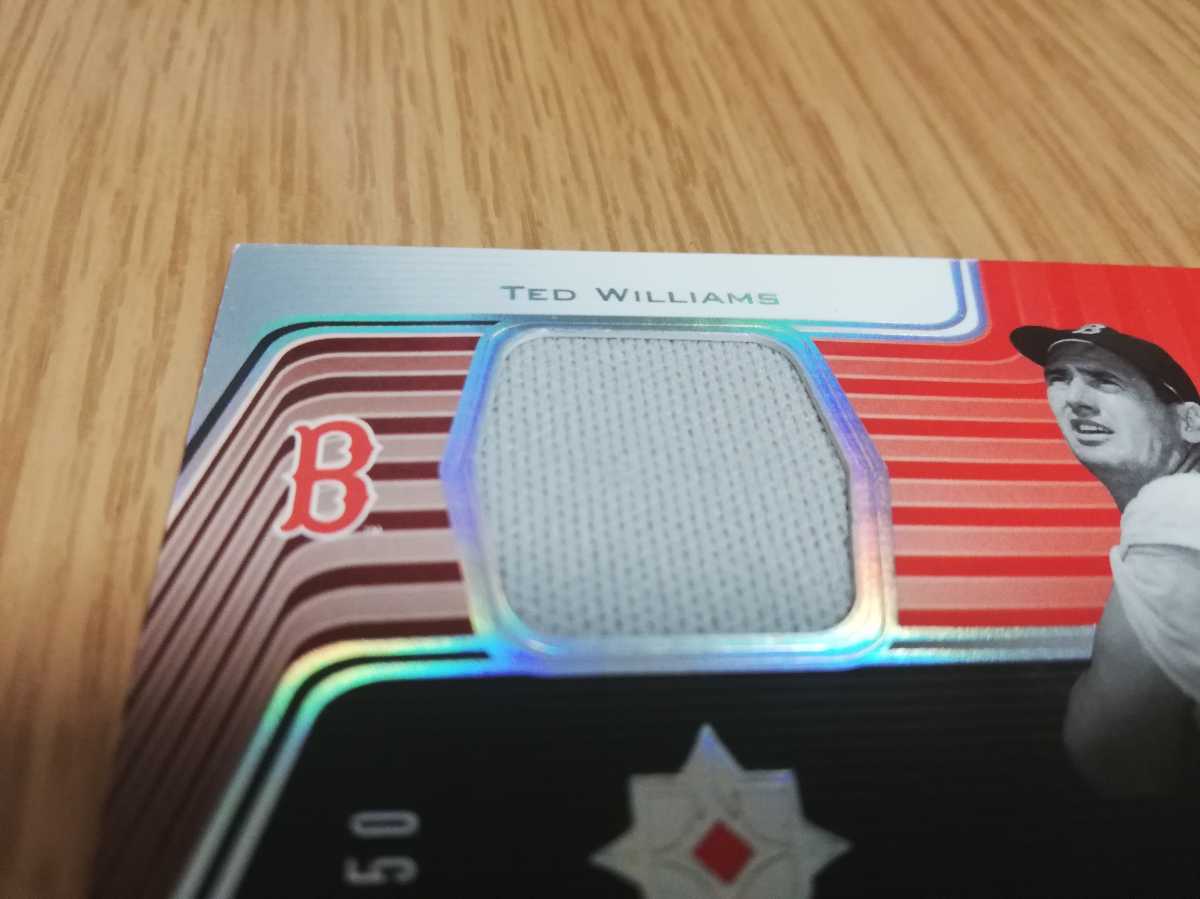 ボストン・レッドソックスの伝説テッド・ウィリアムスがゲームで使用したユニフォームの一片がインサートされたカードです。シリアルナンバー25/50。