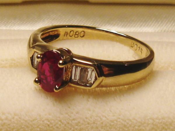 鮮やかで透明感もある綺麗なルビーをセンターに、テーパーダイヤを両側にセットして、独特のシンプルな高級感が出ている品。