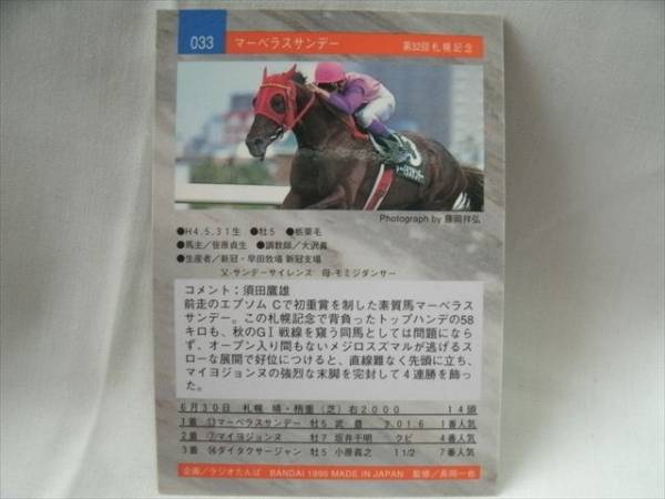 | ☆☆☆商品説明☆☆☆ 【メーカー】 バンダイ 【シリーズ】 96年上半期サラブレッドカード 【番号】 033 マーベラスサンデー 【数量】 1枚 サラブレッドカードの第2弾96年上半期カードになります。 |