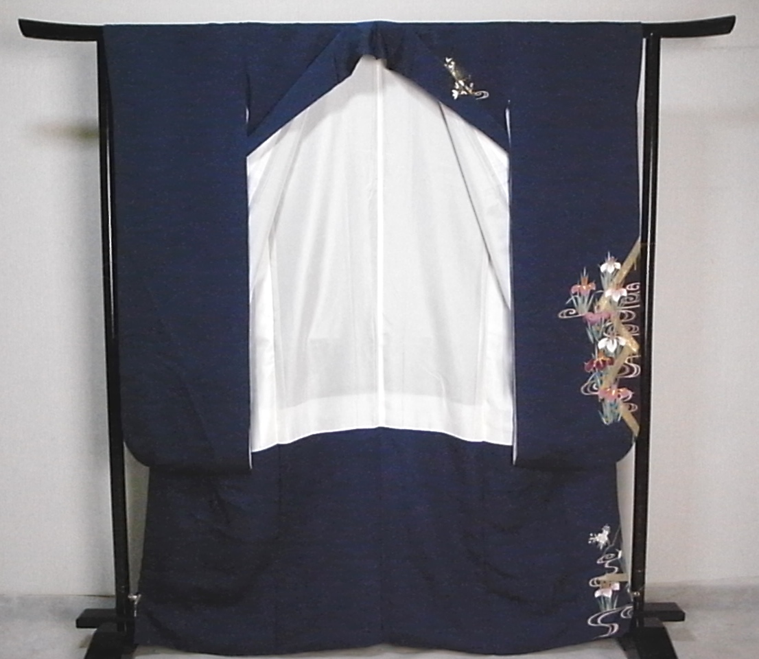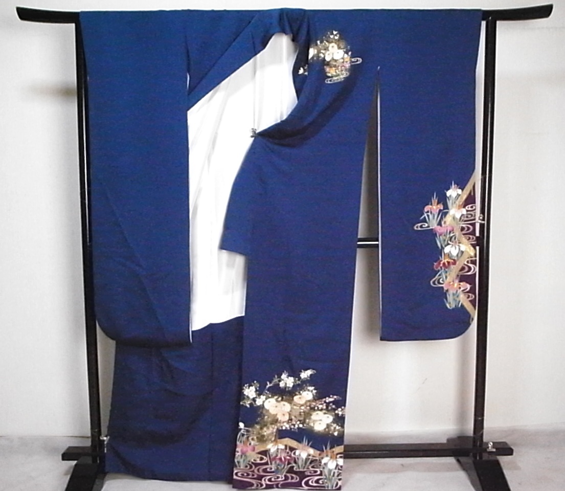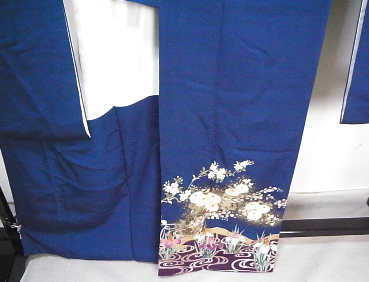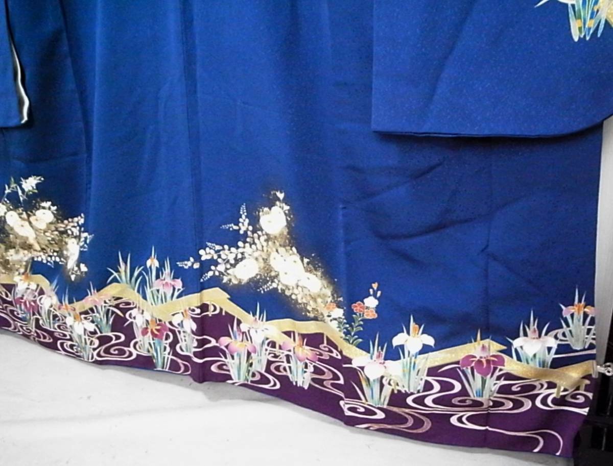 【着物のちさと屋】D111 着物・振袖 袋帯 長襦袢 3点セット Lサイズ 良質 極美品 正絹紋意匠ちりめん 薄紺色地・流水菖蒲柄模様