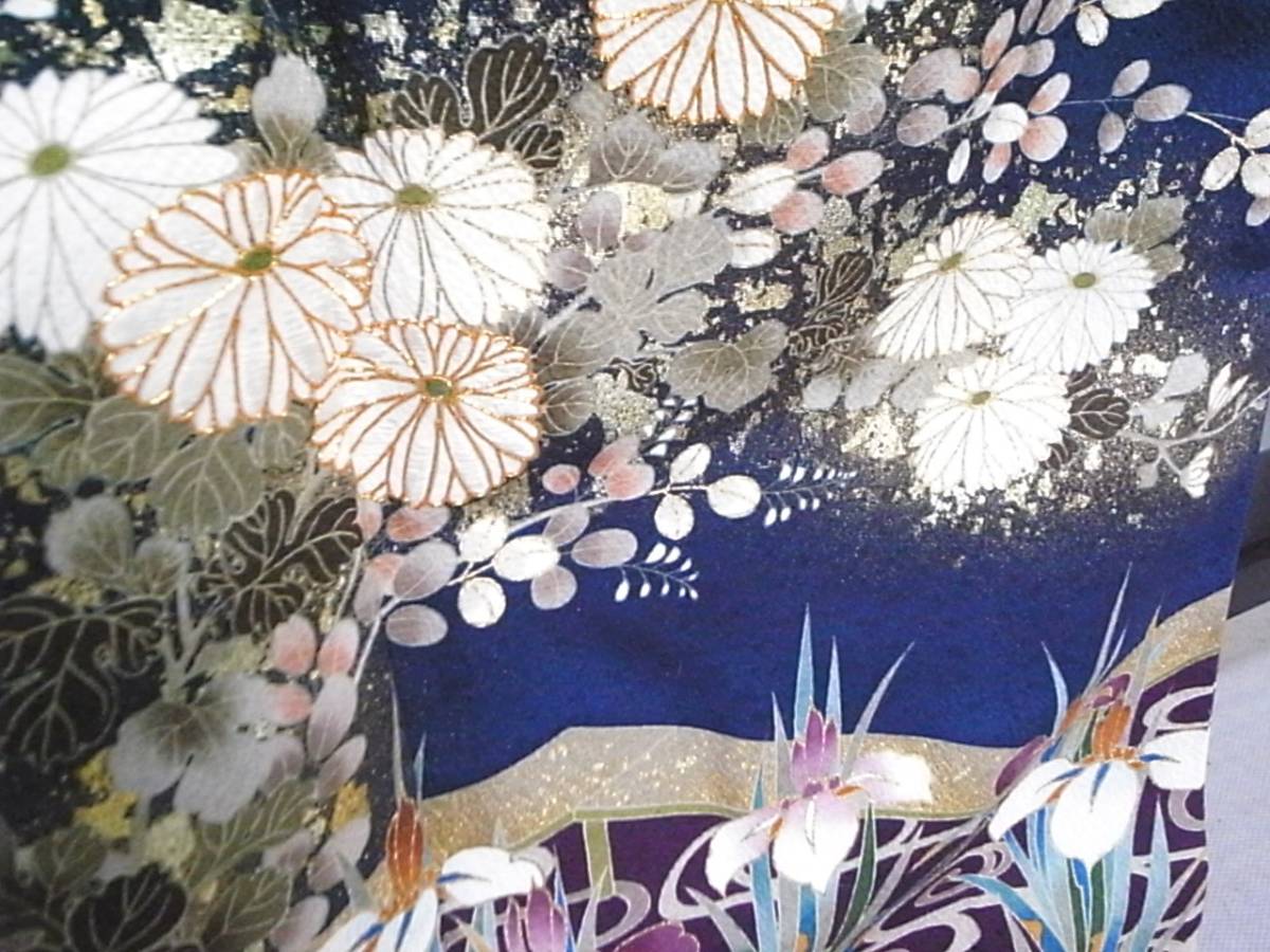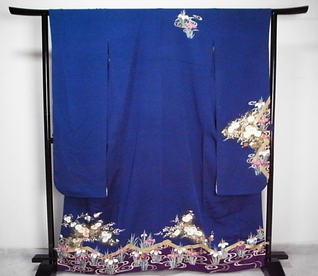 振袖 良質 極美品 正絹紋意匠ちりめん 薄紺色地・流水菖蒲柄模様