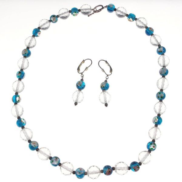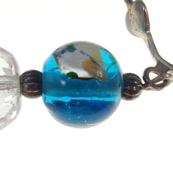 A2918◆ 【留め具シルバー925】◆ 柄付きの青いガラスビーズで飾られたヴィンテージネックレス & ヴィンテージピアス ◆