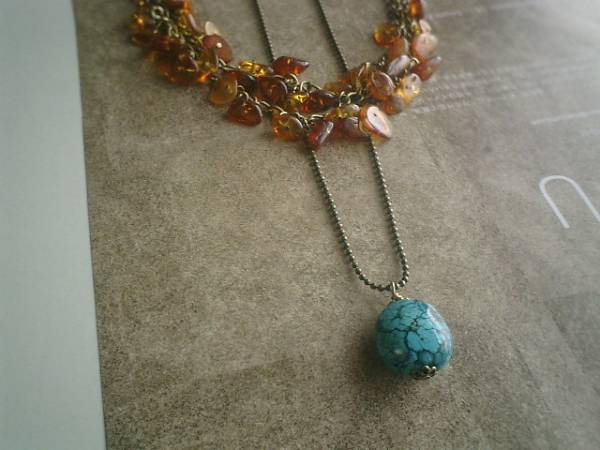 エキセントリック少女・・シリーズです♪琥珀色とターコイズ・・シックな秋色のネックレス2点セットです♪7ミリから13ミリ位までのさざれの琥珀は2連のチェーンにランダムに繋いでキュートな表情です♪長さは全長58センチ位で調節自由です♪チョーカー風にされてもブレスにされても素敵です♪神秘的な模様が美しいターコイズのトップは20×16ミリ位のタンブルです♪繊細なボールチェーンを合わせてアンティークモダンしています♪長さは68センチ+アジャスター12センチで最長80センチ位です♪それぞれ単品やお揃いのブレスレットやイヤリングも出品しています♪♪シンプルで合わせやすいデザインを考えて作りました♪ハンドメイドをご理解いただいてノーリターン、ノークレームでお願いします♪