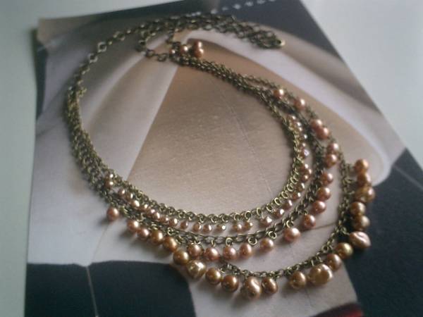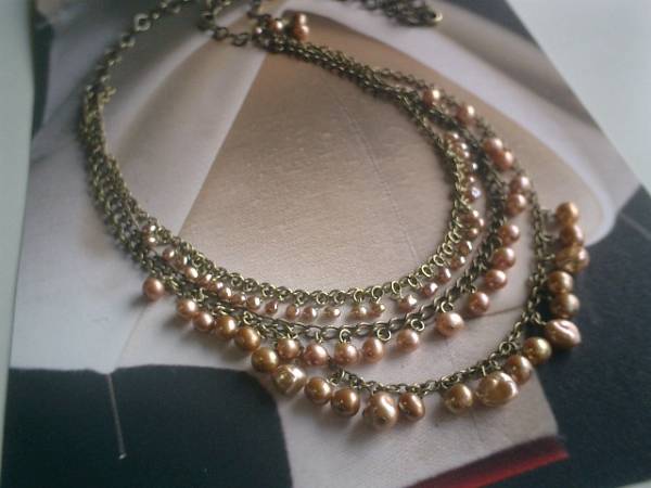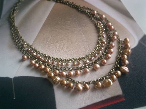 大人色の物語・・シリーズです♪3連の淡水パール・・シックなシャンパンゴールドの淡水パールのネックレスです♪3ミリから9ミリ位までのポテト、バロック、芥子などデザイン違いの淡水パールを3連のチェーンで繋いでキュートモダンしています♪長さは全長95センチ位で調節自由です♪長さによって表情が変わりますので色々なシーンで楽しんでいただけます♪お揃いのブレスレットやピアスも出品しています♪シンプルで飽きのこないいつまでも着けられるデザインを考えて作りました!ハンドメイドをご理解頂いてノークレーム、ノーリターンでお願いします