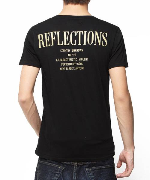 文字とレディフォトを大胆に組み合わせた、尖ったグラフィックが目を引くVネックTシャツ。