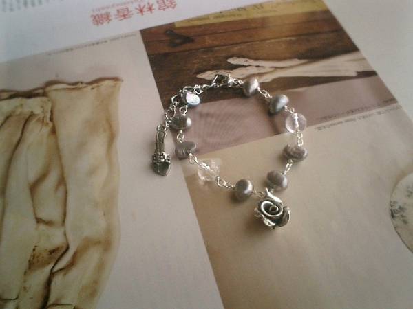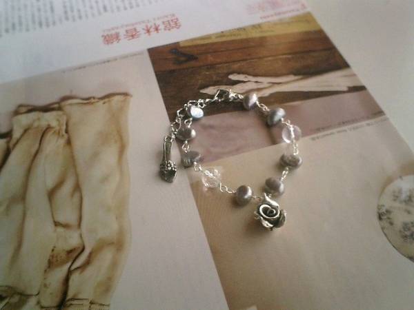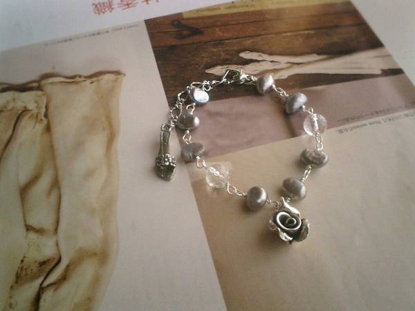 素敵・マニア・・シリーズです♪薔薇とパールと水晶と・・シックなシルバーグレーの淡水パールのブレスレットです♪カレンシルバーの薔薇やランダムカットの水晶を合わせてさりげなくロマンチックしています♪淡水パールは8ミリから9ミリ位のバロックです♪水晶は8ミリのランダムカット、カレンシルバーの薔薇は12ミリ位です♪長さは全長23センチ位で調節自由です♪お揃いのネックレスも出品しています♪シンプルで飽きのこないいつまでも着けられるデザインを考えて作りました♪ハンドメイドをご理解頂いてノークレーム、ノーリターンでお願いします