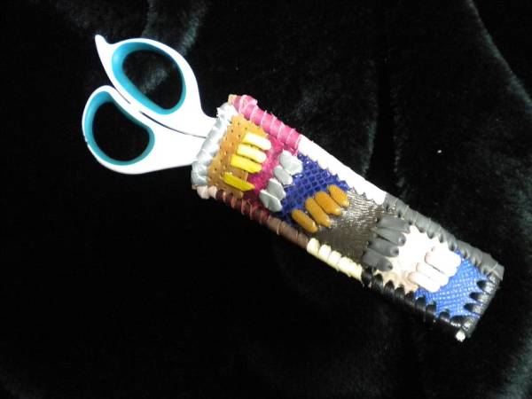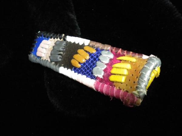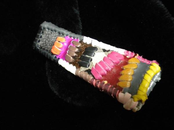 ケース表面は、レザーをカットしたものに、かがりをして、パーツをつなぎ、パッチワーク調にして、仕上げました。