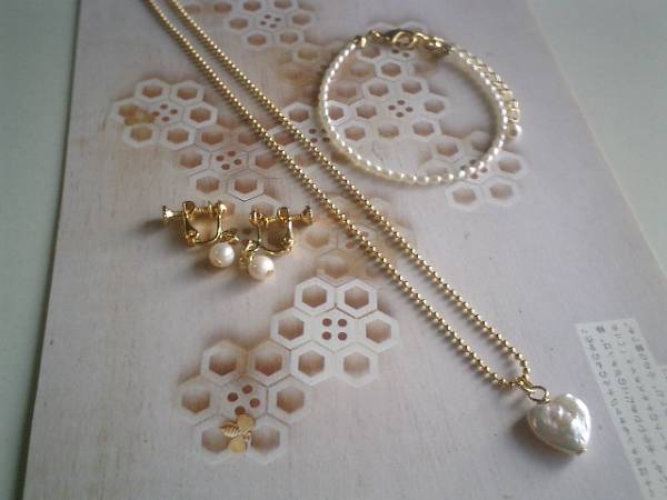 ロゼッタの宝石箱・・シリーズです♪淡水パール・デッサン・・小さなハートやポテトやライスなどデザイン違いの淡水パールのネックレス、ブレスレット、イヤリングの3点セットです♪シンプルなデザインなので色々なシーンで楽しんでいただけます♪ネックレスは12ミリ位のハートの淡水パールに華奢なボールチェーンを合わせました♪長さは74センチ+アジャスター12センチで最長86センチ位です♪ブレスレットは2×3ミリ位の淡水パールです♪長さは16センチ+アジャスター6センチで最長22センチ位です♪イヤリングは6ミリ位のポテトのペアセットです♪長さは2・5センチ位です♪ピアスにも変更出来ます♪それぞれ単品でも出品しています♪シンプルで飽きのこないいつまでも着けられるデザインを考えて作りました!ハンドメイドをご理解頂いてノークレーム、ノーリターンでお願いします