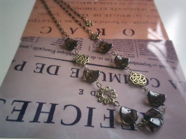 ジゼルの宝石箱・・シリーズです♪大人色のダークブラウン・・繊細なスモーキークォーツのネックレスです♪薔薇のチャームを合わせてロマンチックな表情です♪スモーでキークォーツは15ミリ位のコインツイストです♪長さは全長72センチ位で調節自由です♪チョーカー風にされても素敵です♪♪お揃いのブレスレットも出品しています♪シンプルで飽きのこないいつまでも着けられるデザインを考えて作りました!ハンドメイドをご理解頂いてノークレーム、ノーリターンでお願いします