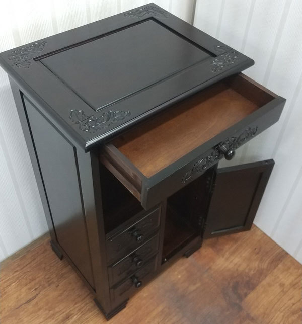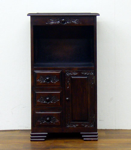 | 前面や側面に施した飾り彫りは、鍛錬された職人による手仕事です。 FAX台として、天板には電話やFAXを、天板下の引出は浅く設計しておりますので、 メモやペン等を収納するだけでなく、メモ書き用の台としてもご利用頂けます。 | ||||||||||||||||||||||||||||||||