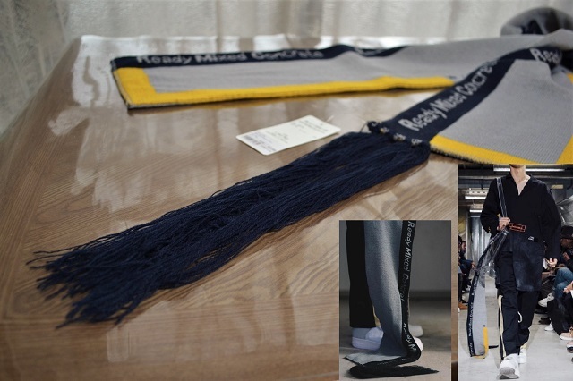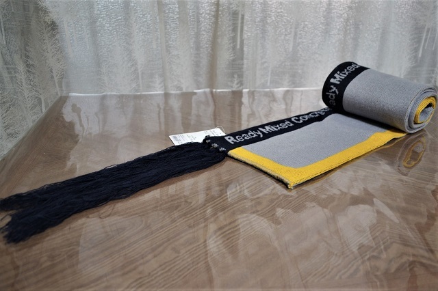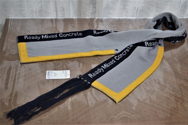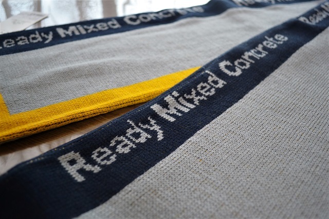 生コン車のカラーリングに多いイエローと、コンクリートカラーのグレーをメインカラーに採用し、コンクリートが生コン車のシュートを伝って落ちる様子をフリンジで再現させています。READY MIXED CONECRETEと銘打つ意味合いがわかると、なるほどと思えるマフラーです。