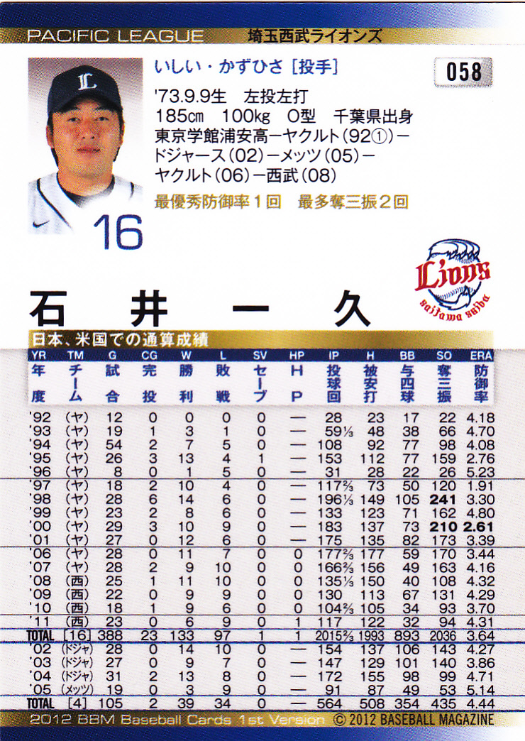 2012BBMベースボールカード1st 058 石井一久 西武 千葉県 東京学館浦安高校 ヤクルト ドラフト1位