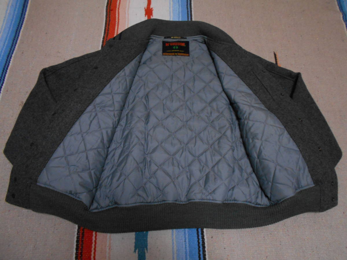 ビンテージ McGregor 特有の肌触り良く丈夫な起毛天然ウール素材感、ショルダーの補強も兼ねた本革レザーガゼット、重厚なショールカラーリブ、ルーズすぎない絶妙なシルエット、ハンドウォーマーエッジのレザー補強、カレッジカジュアル 校章ワッペン、黎明期 「McGREGOR」 ツインタツノオトシゴ刺繍タグ 等等等... 近年のプロダクトには絶対にない風合いの良さ