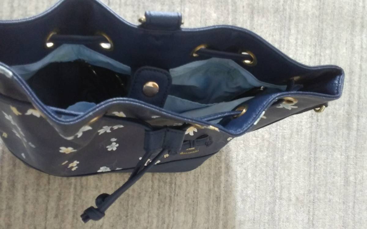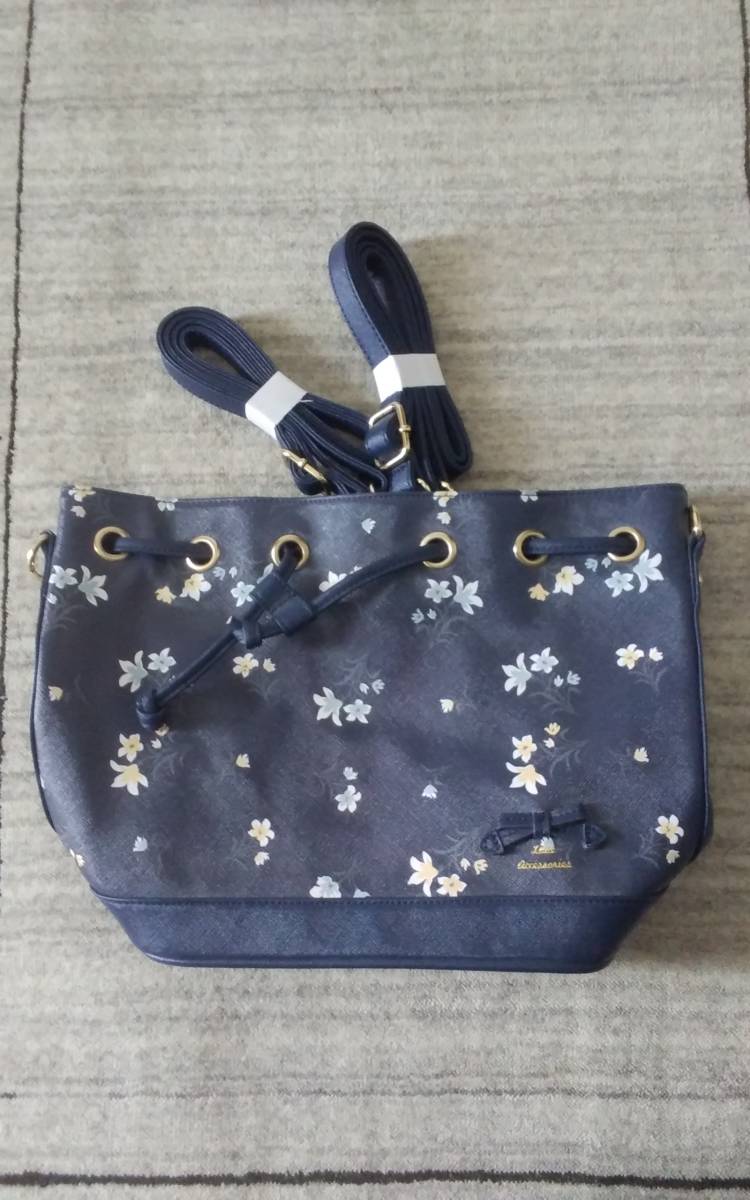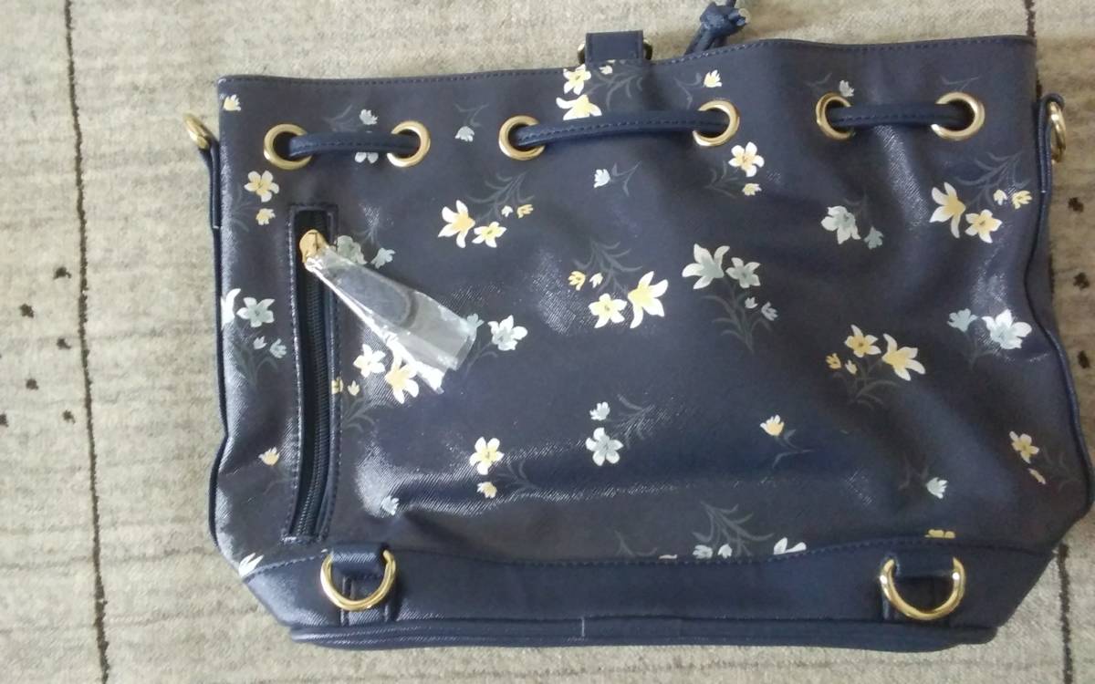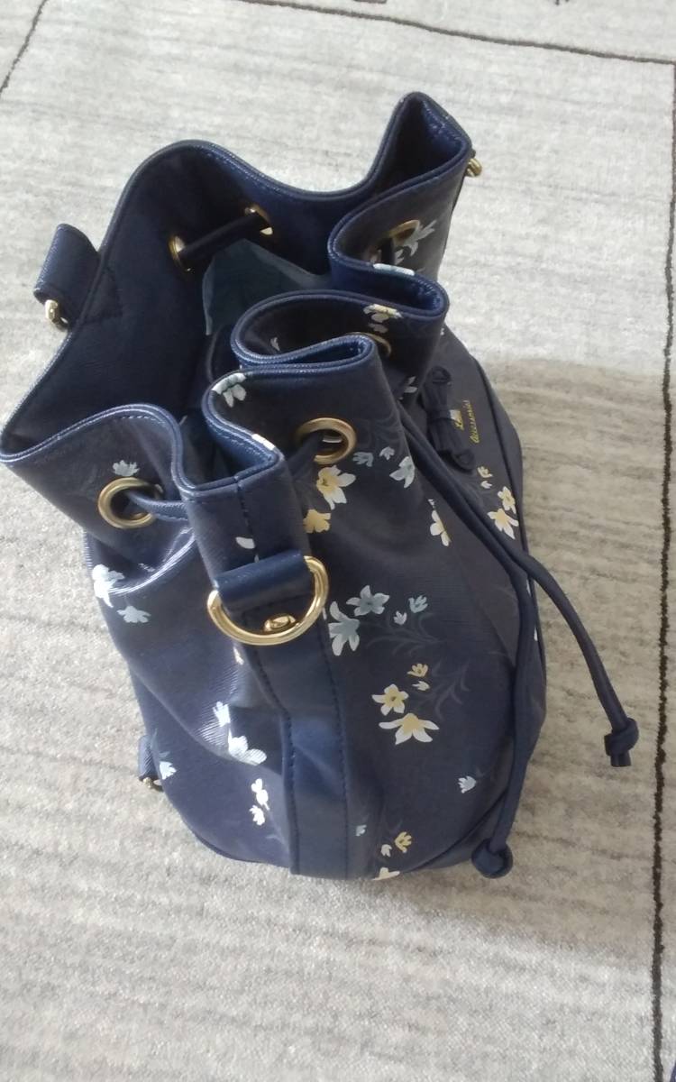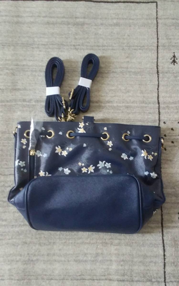 素材:合皮、カラー:紺×花柄、開口部留具:マグネット、ポケット:外内ファスナー、内ファスナー、携帯他1、片紐は2本。ショルダーとリュックの2way。
