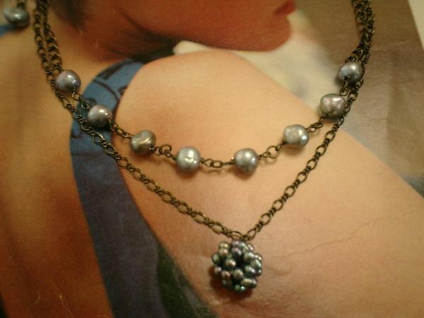 グレー色(?)淡水パールのシックなネックレスを作りました♪ネックレス2本とブレスレットの3本セットです♪いろいろな組み合わせで楽しんでいただけます♪シンプルなデザインのトップの淡水パール玉は11ミリ位です。長さは全長50センチ位で調節自由です。大き目の淡水パールは6ミリから7ミリのバロックで長さは全長51センチ位で調節自由です。お揃いのブレスレットは同じ淡水パール玉で11ミリ位です。長さは全長21センチ位で調節自由です。チャコールグレーのお色で繊細で大人っぽい可愛さです♪3本ともシンプルなデザインなので長く着けて頂けると思います。ハンドメイドをご理解頂いてノークレーム、ノーリターンでお願いします