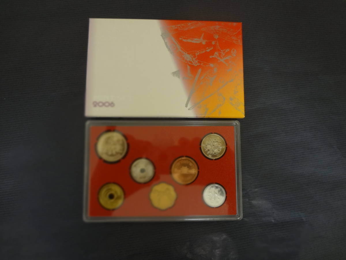この貨幣セット(ミントセット)は、造幣局で製造した一度も使用していない平成18年銘の貨幣(500円、100円、50円、10円、5円及び1円の6貨種)を各1枚と、丹銅製の年銘板1枚を、プラスチックケースに組み込み、外装紙ケースに収納したものです。
