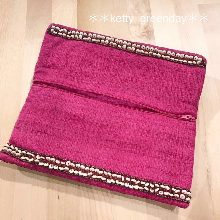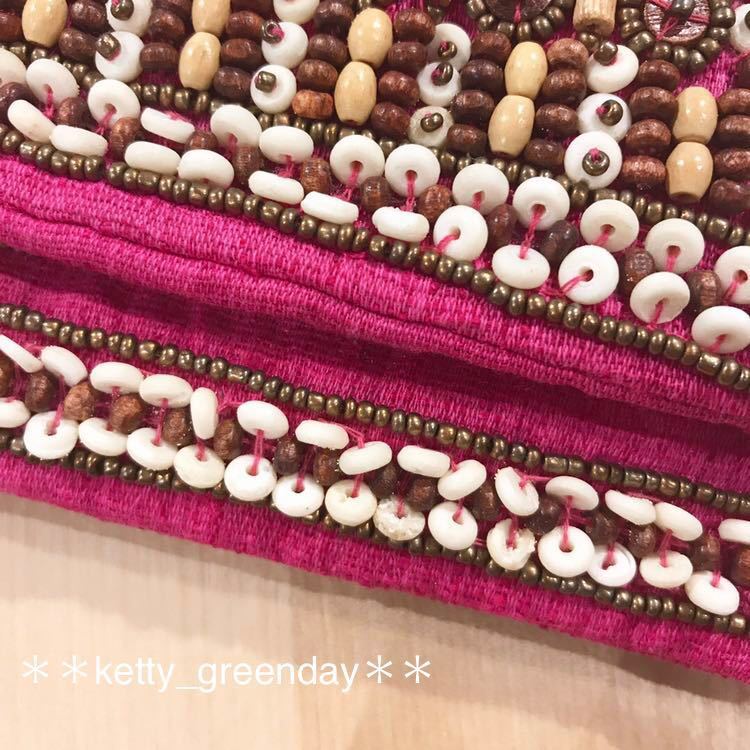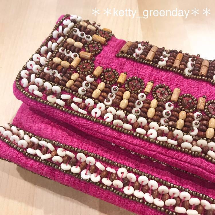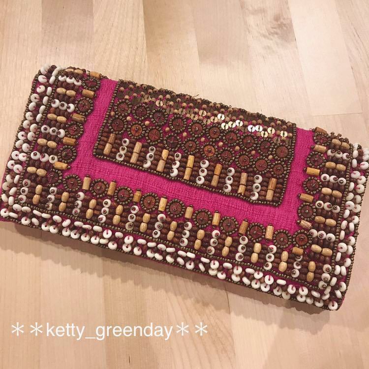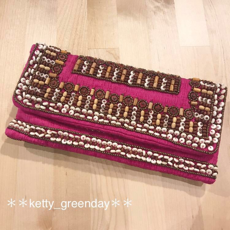 ウッドビースなど、装飾がステキなクラッチバッグです♪